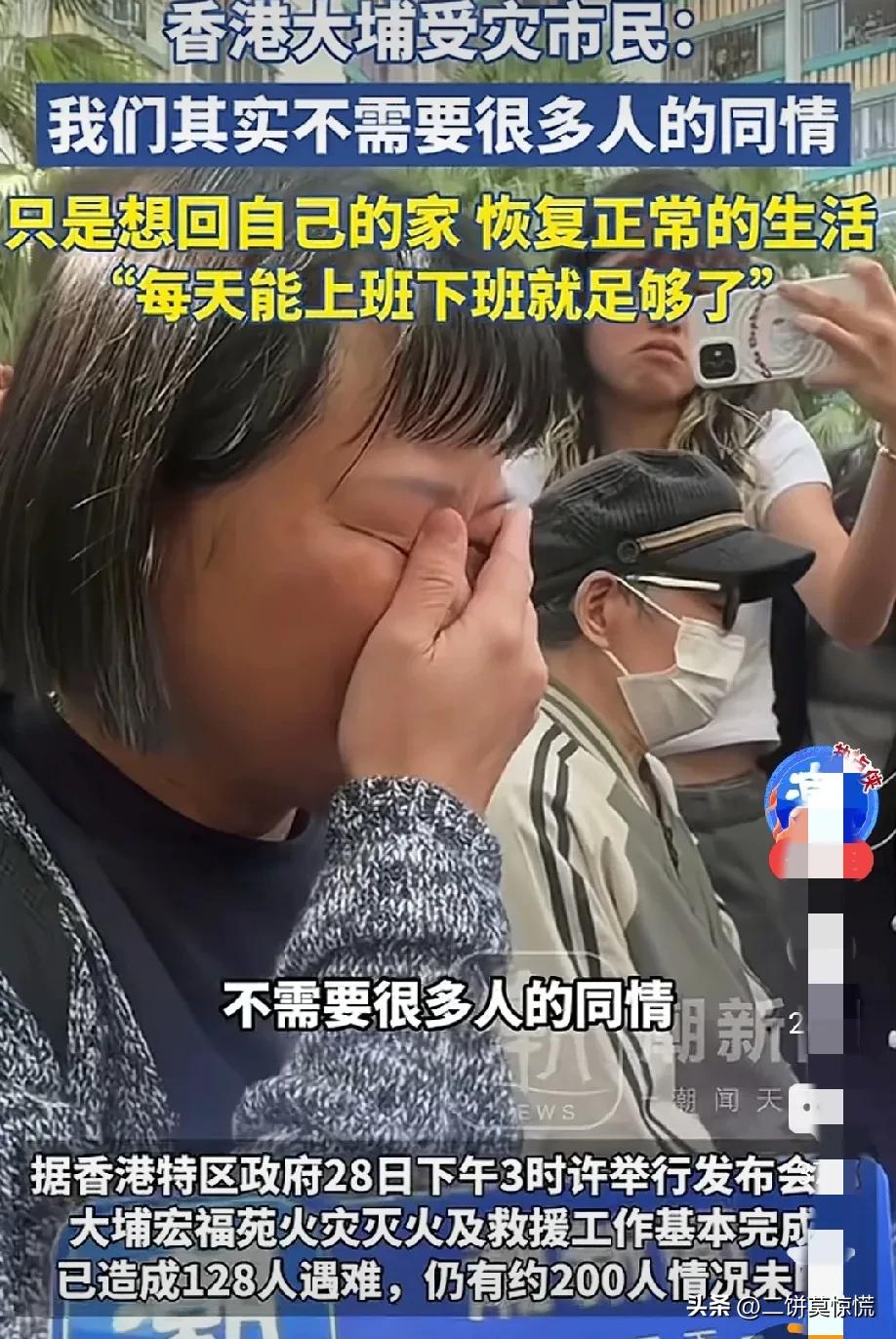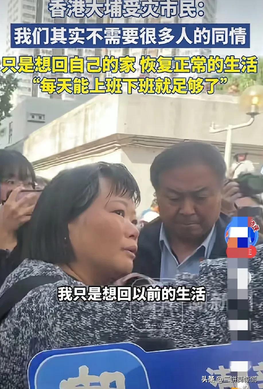 香港受灾群众的一句话,直接让人泪目。 她说: 我们不需要别人的同情,我只想回到自己的家,恢复原来的生活,每天能上班下班,回到家照顾家人,过简单的日子就足够了,可是,这都不行啊。 听完这段话,直接让人绷不住哭了。 原来,人是会突然失去一切的。我们习以为常的生活,我们熟悉的家人,我们住了一辈子的房子,会在某一天,突然不见了。 一场大火,一场水灾,一个地震,甚至一个疾病,都可能会让你熟悉的一切灰飞烟灭。 所以,从此刻起, 活着的人啊, 请好好珍惜当下, 看淡一切是非对错, 停止一切焦虑,内耗,仇恨, 因为, 在无常面前, 这一切真的都不算什么。
