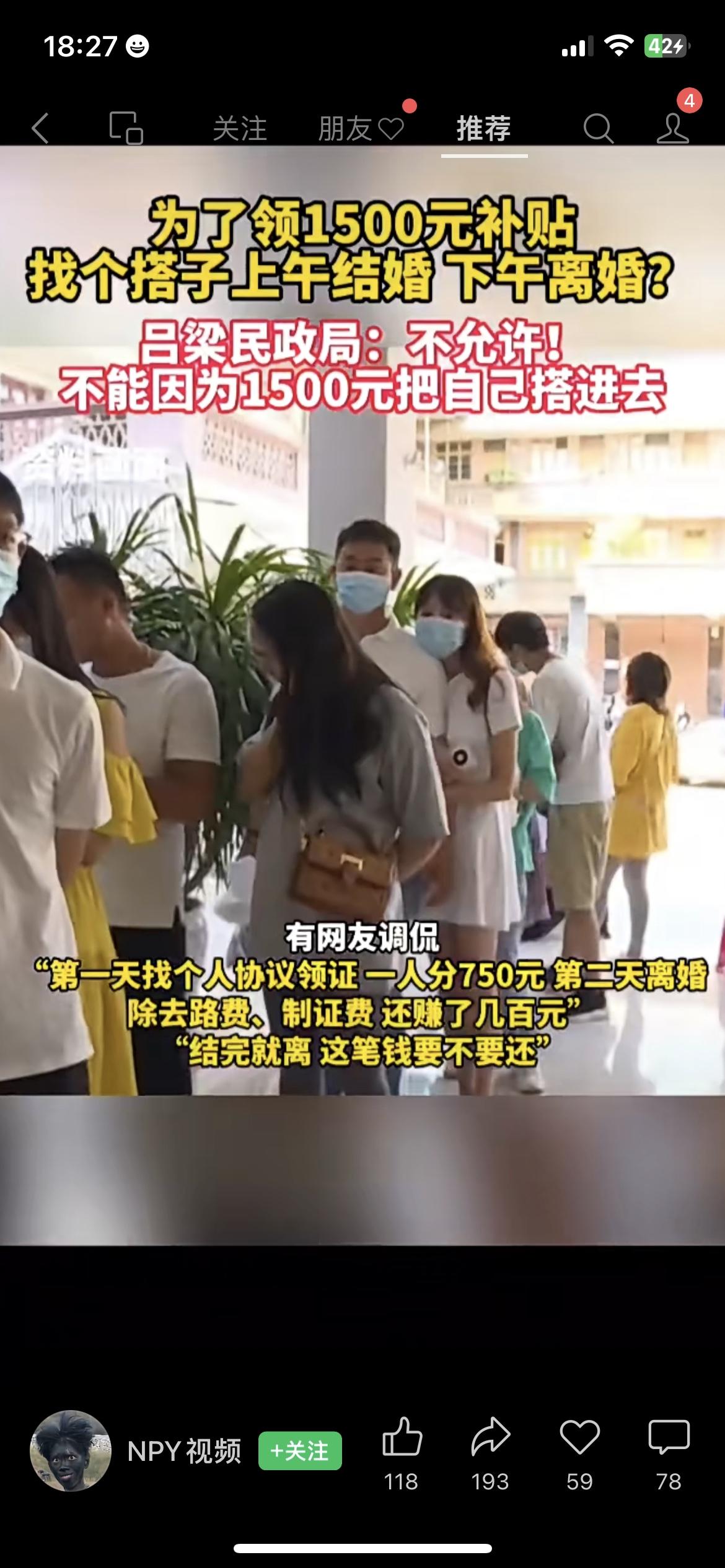吕梁这补贴把网友整疯了!为1500块找搭子“上午结婚下午离”,民政局急了:这钱别要了! 吕梁这1500块结婚补贴,现在真有人想“钻空子”! 刚刷到有网友盘算:找个搭子,上午领证分750块,下午离婚,扣掉工本费还赚几百——结果民政局直接喊话:绝对不行!这钱是给真结婚的,别为这点钱把自己婚姻记录搭进去! 其实这补贴条件挺实在:头婚、女方35岁内、至少一方吕梁户口,领证当场拿现金,已经发了1.8千万,真结婚的新人早把这钱当蜜月基金了。 现在评论区吵翻了: 有人喊“迁户口还来得及吗”,有人骂“钻空子的太离谱”,还有人说“要真给这种人发钱,才是对真结婚的不尊重”。 吕梁1500元结婚补贴 你觉得这空子能钻吗?