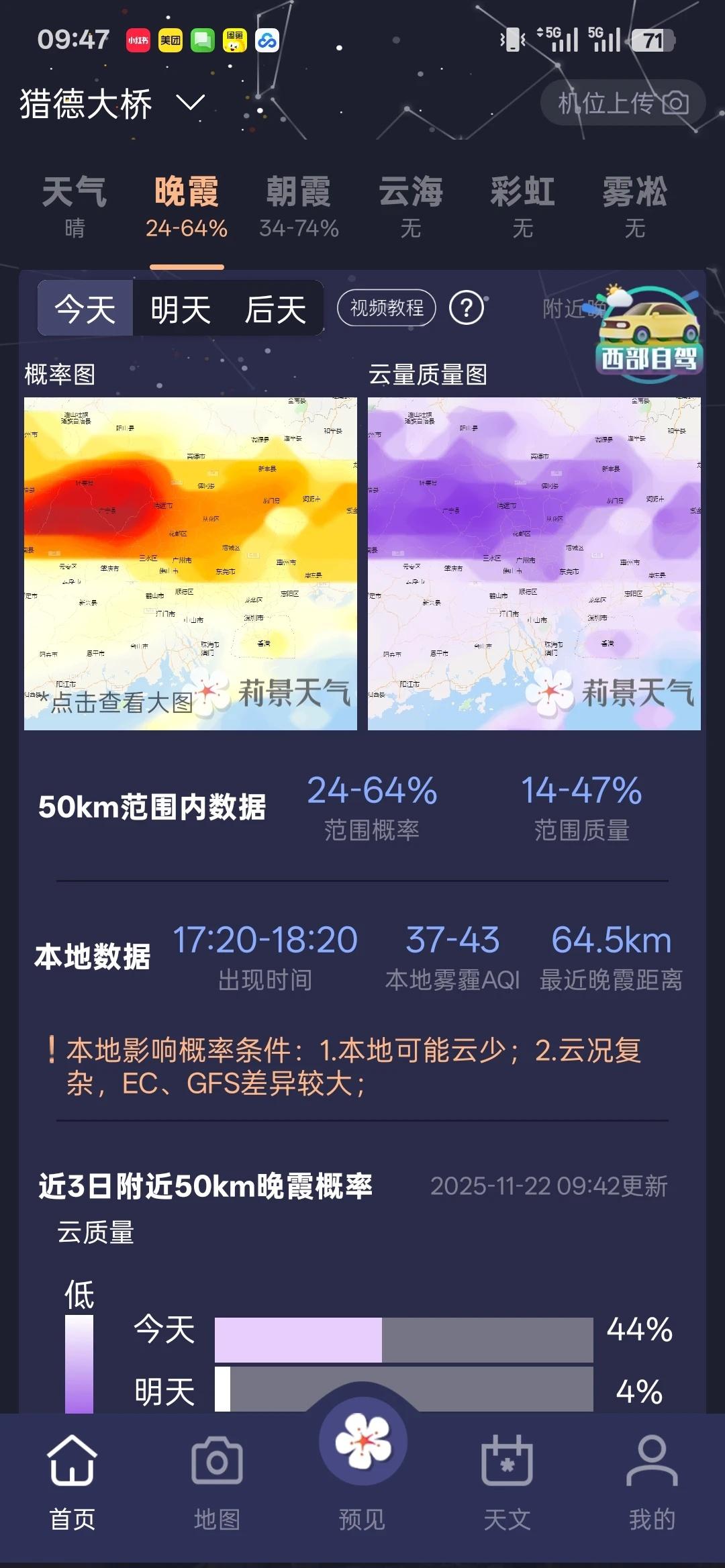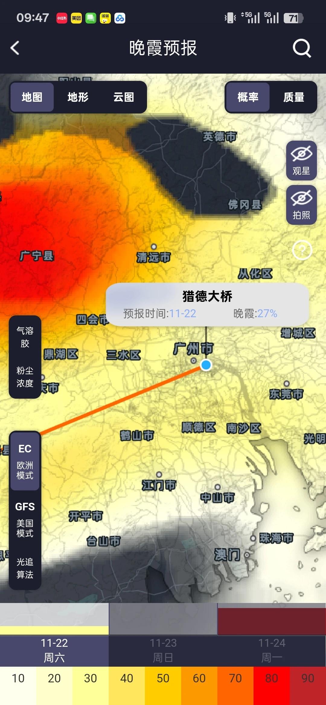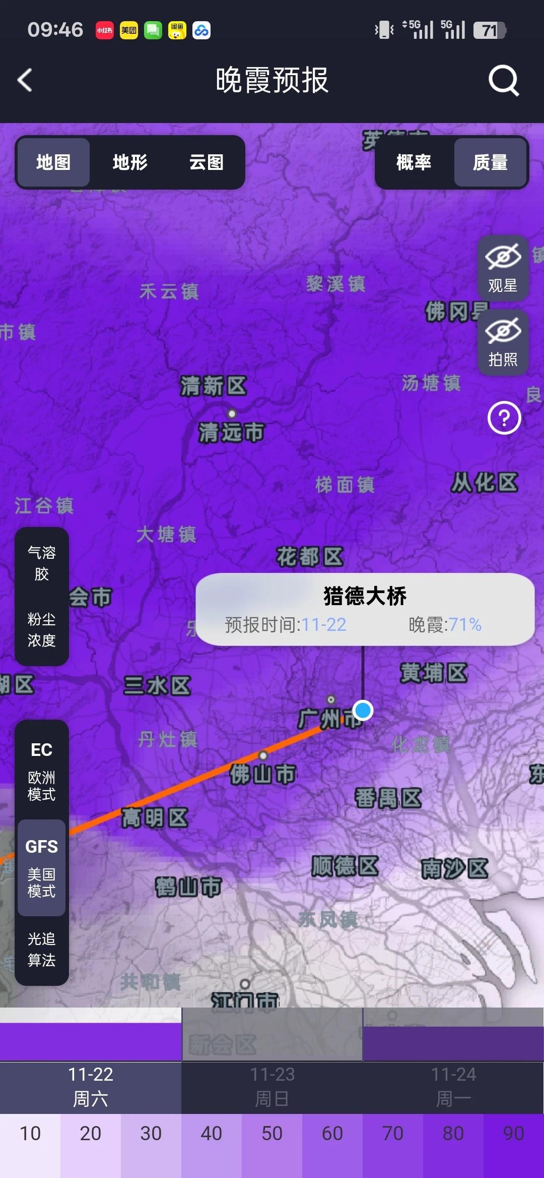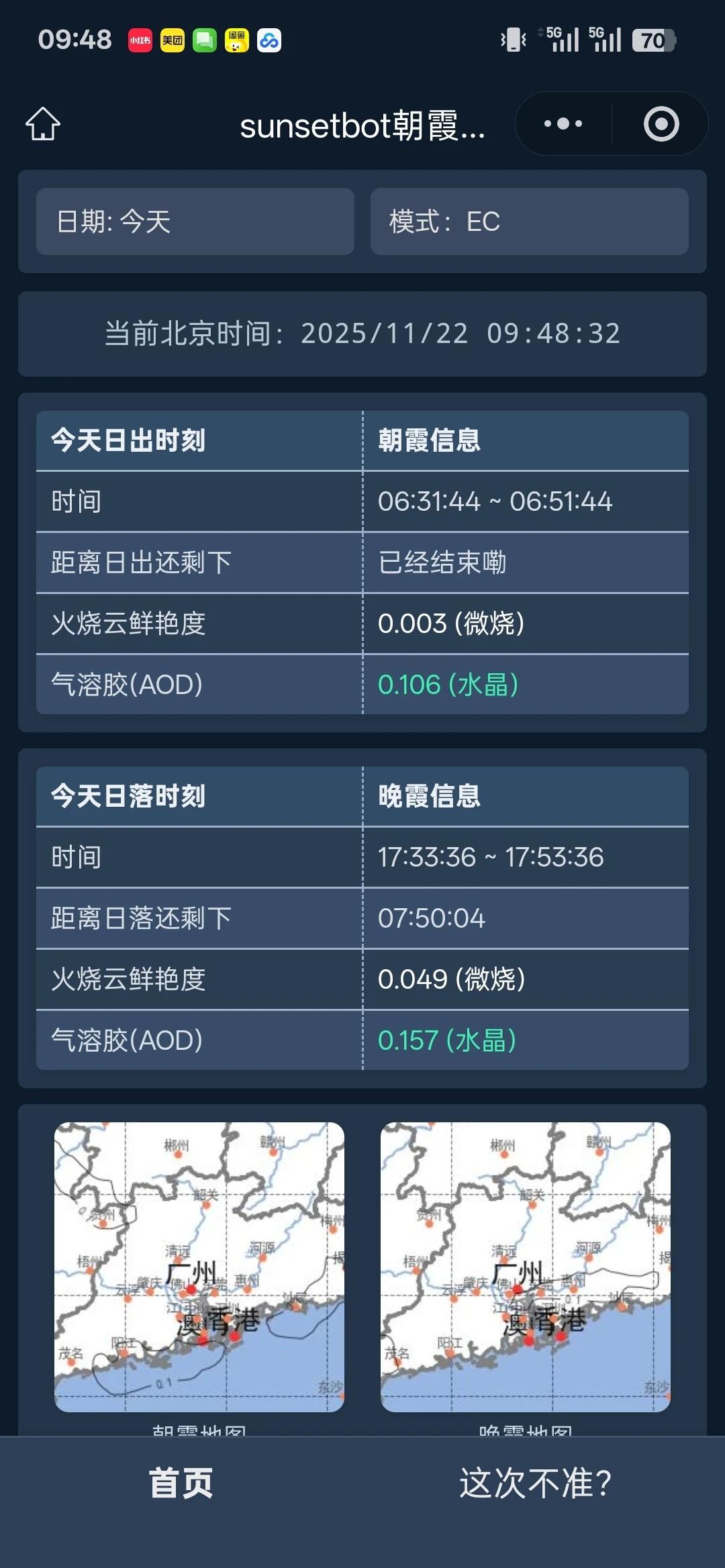 11.22广州晚霞预告,大烧概率? 目前莉景天气GFS模式给出72%的概率,EC模式概率是27%。不过Sunsetbot目前只给出微烧。今天的空气质量依然比较高,和昨天是一样的水晶天。气溶胶非常低,能见度高。希望日落时候云况不错能出一下晚霞。今天会持续观察。 综合来看,今天是粤北的主场。温馨提示:追霞需要平常心,接受不了翻车的朋友请慎重考虑出行。火烧云 晚霞 广州晚霞 日落晚霞火烧云 火烧云晚霞 火烧云满天 日落 傍晚火烧云 一起看晚霞