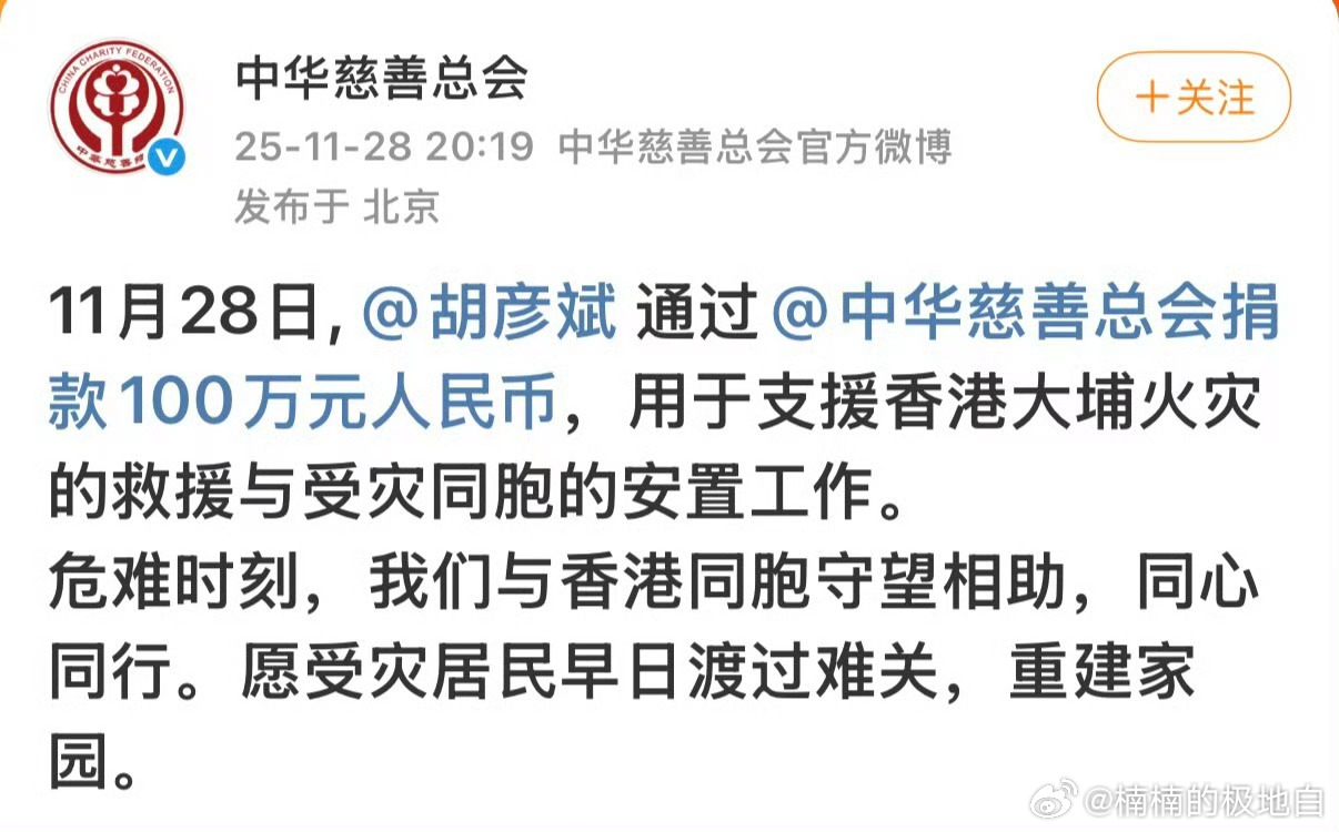 胡彦斌向香港捐款100万胡彦斌捐赠100万元 100万传递深情!胡彦斌助力香港大埔火灾救援与安置,多年深耕公益不缺席,用行动传递善意,同心守护平安~