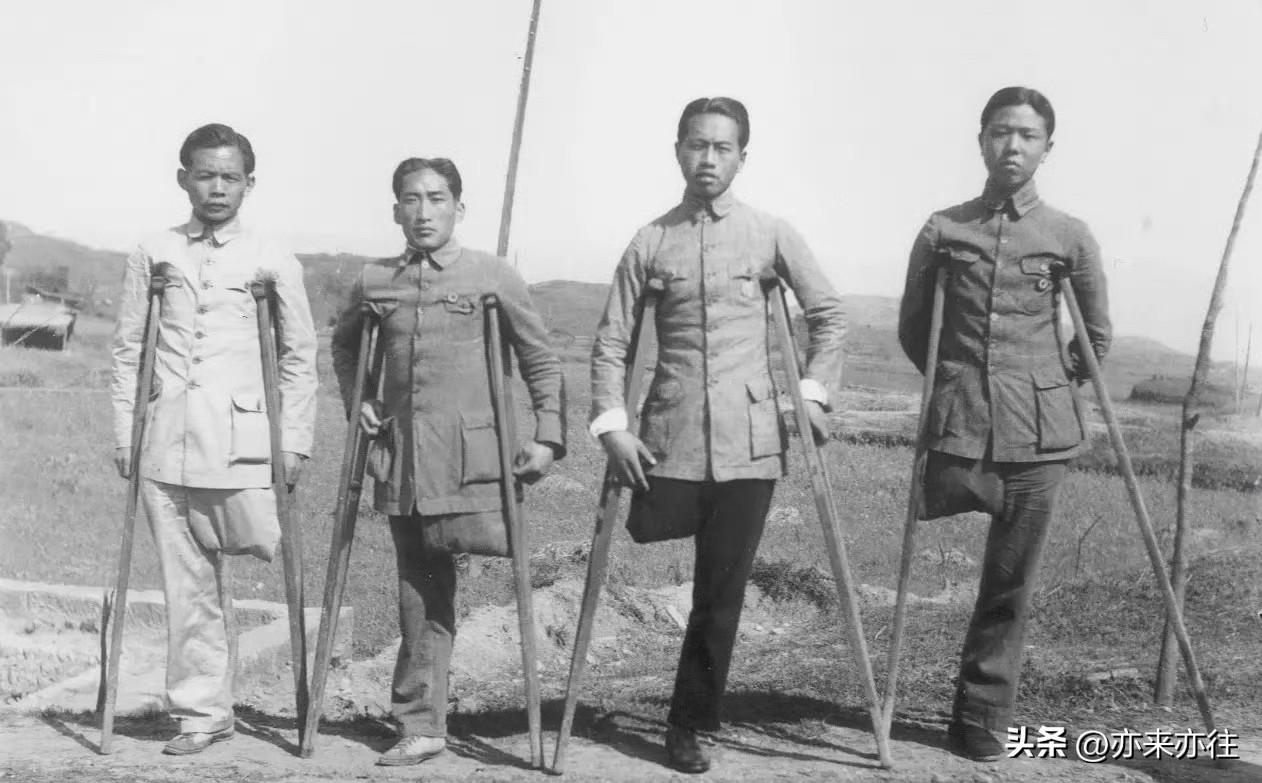 老照片赏鉴:4个人仅有4条腿?的确如此,照片里的4个人都拄着拐杖,每个人都失去了一条腿…… 原来他们当年都是国民革命军的战士,于1937年的淞沪会战战场上奋勇杀敌,不幸失去了一条腿。 他们皆是中华民族的英雄,请铭记英雄的名字:李家雄、葛仁祥、任成玉、曾炳山! 向他们致以崇高的敬意! 革命军人老照片 抗日老照片 淞沪抗战老照片