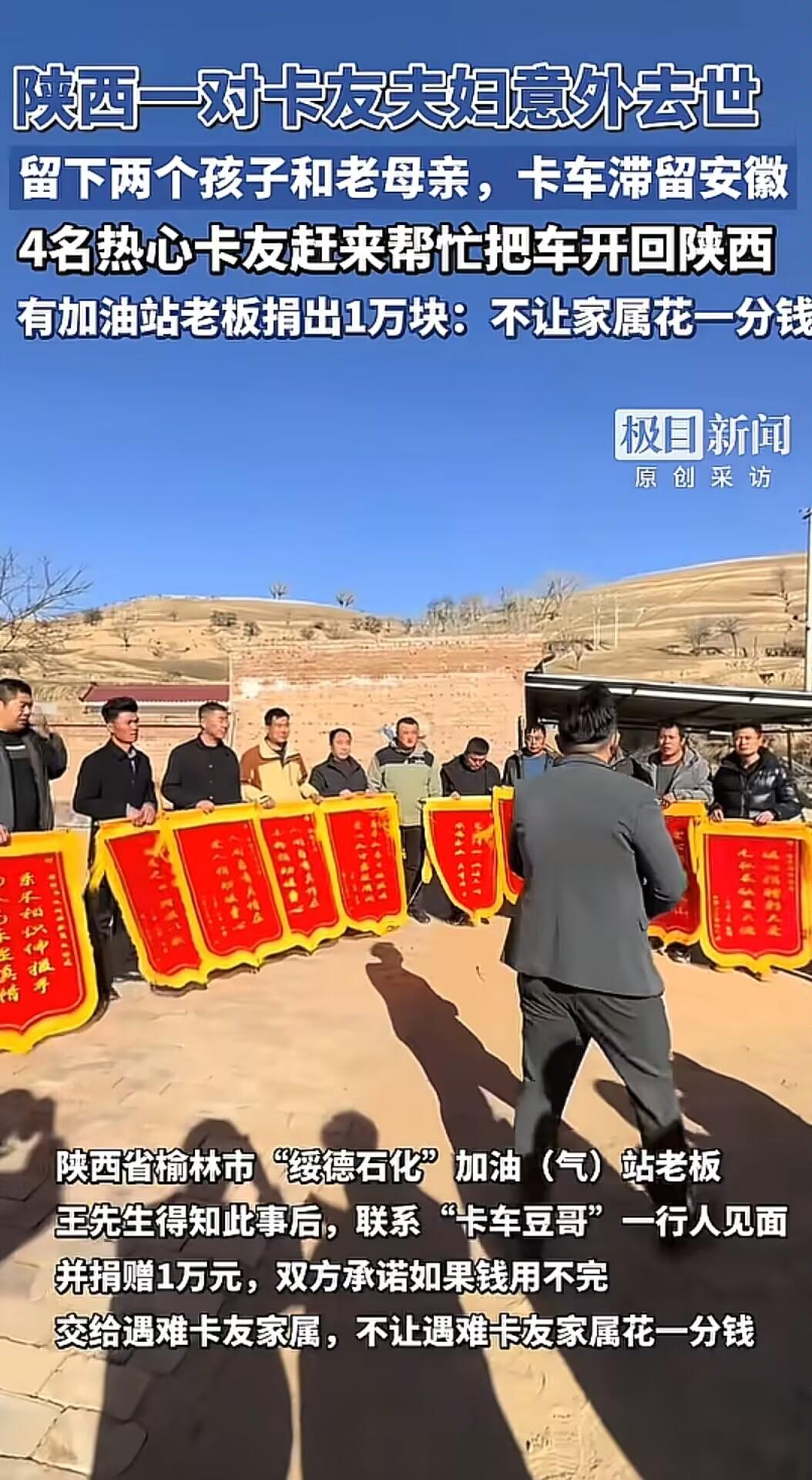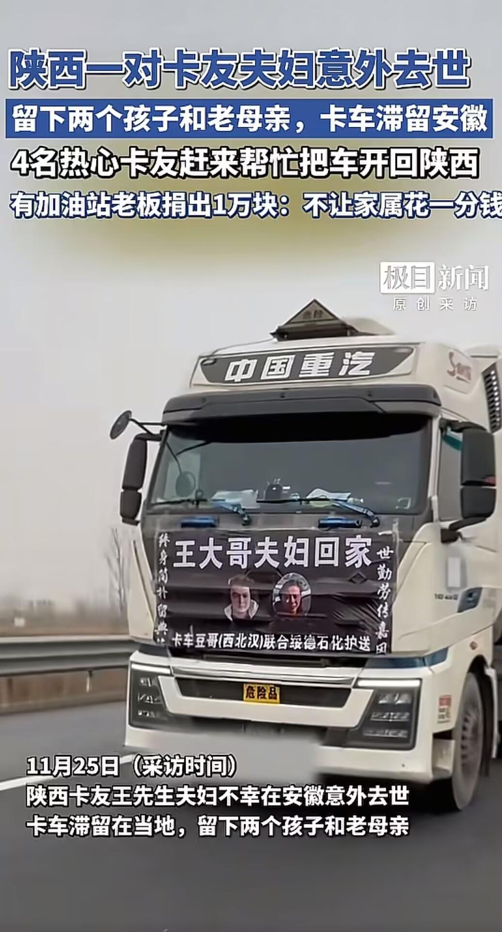 陕西靖边那对把卡车当家的货运夫妻,11月25号在安徽一个物流园卸完货,正给车子做常规检修呢,没成想意外突然砸下来,俩人事儿当场就没了。交警已经介入调查了,具体为啥出事还没说,可目击者拍的视频一传开,全网都跟着揪心,视频里他俩最后还并肩查车,那身影看着就疼人,现在不少好心人都自发帮着家属处理后事。 11月25号那天,俩人拉着货到了安徽一个物流园,顺利卸完货后,就像往常一样,并肩给车子做常规检修。谁也没料到,意外就这么毫无征兆地砸了下来,俩人事儿当场就没了。交警很快就介入调查了,具体是因为啥出的意外,目前还没出官方说法,可目击者拍的一段短视频一传到网上,瞬间就引发了全网关注。 视频里,夫妻俩穿着厚实的工装,凑在车旁仔细检查轮胎和阀门,动作熟练又默契,那是他们跑了十年货运养成的习惯,也是俩人最后的同框画面。明明前一秒还并肩查车,下一秒意外就发生了,没有猛烈的撞击,也没有刺耳的刹车声,就这么静悄悄地,两个鲜活的人就没了。 网友们看着视频里那两个朴实的身影,都忍不住心疼,评论区里满是“太可惜了”“看着就疼人”的感慨,不少人说着说着就红了眼。 这对夫妻是80后,跑货运这十年,几乎把所有时间都耗在了这辆卡车上。两平米的驾驶室,白天像个密不透风的高压锅,闷得人喘不过气,晚上又成了漏风的冰窖,冷得缩成一团。 饿了就啃几口随身携带的冷饭,困了就裹着军大衣在驾驶座上眯一会儿,日子过得格外辛苦。可即便这样,他们也没敢停下脚步,毕竟方向盘一停,全家的生计就没了着落。 家里最值钱的就是这辆卡车,是两个孩子未来的学费来源,也是支撑整个家的顶梁柱。 如今人没了,车还扔在千里之外的安徽,老母亲病重卧床,两个未成年的孩子茫然无措,整个家瞬间就垮了。就在家属最绝望的时候,不少好心人自发站了出来,帮着处理后事。 货运圈的几位榆林热心卡友看到求助信息后,没多犹豫就凑成了“接车小队”,打算把那辆卡车从安徽开回陕西靖边,那是夫妻俩最后的家当,也是孩子们的希望。 为了尽快把车开回来,这四位汉子定下“人歇车不歇”的规矩,日夜兼程赶路。路上不少人得知他们是帮遇难同行接车,都主动伸出援手:加油站老板二话不说掏了一万块现金,一位榆林的老板专门拦下车队塞了一万块路费,接车小队更是把自己的路费和路上的余款八千多块,一分不少地交给了孩子。 全网的好心人也没闲着,行业内的捐款像雪花一样飞向这个摇摇欲坠的家庭,大家都想着能帮这家人多分担一点。民政部门的救助也已经在路上,希望能给这孤儿寡母多一份保障。 现在车是顺利开回靖边了,可那个父亲把着方向盘、母亲坐在一旁唠家常的温馨画面,再也不会有了。两个孩子摩挲着挡风玻璃内侧那张褪色的全家福,那是这个家里最后一点温存。 其实在货运行业里,还有无数像这对夫妻一样的“夫妻档”,他们每天都在算计着生计和风险,为了多省一点钱,甚至要做一些生死博弈。希望以后每一对跑货运的夫妻,每一次出发都能平平安安,不用再为了省钱,去赌上自己的性命。 信息来源:极目新闻
