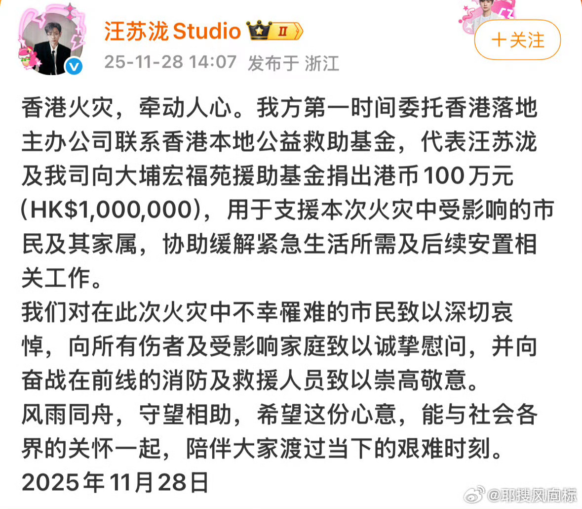 汪苏泷捐赠100万元汪苏泷方捐款了100万港币驰援香港,并对在此次火灾中不幸罹难的市民致以深切哀悼,向所有伤者及受影响家庭致以诚挚慰问,并向奋战在前线的消防及救援人员致以崇高敬意,希望陪伴大家渡过当下的艰难时刻