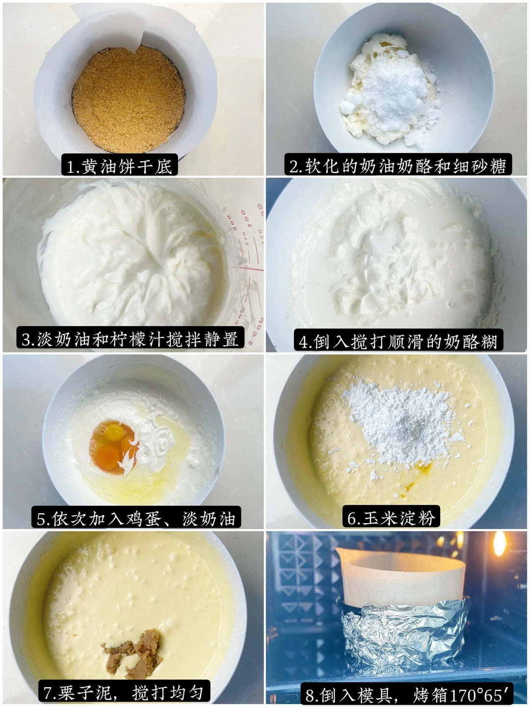 焦糖饼干80g 黄油40g 奶油奶酪230g 酸奶油(淡奶油150g+柠檬汁15g)淡奶油100g 鸡蛋3个 玉米淀粉20g 细砂糖100g 栗子泥100g
