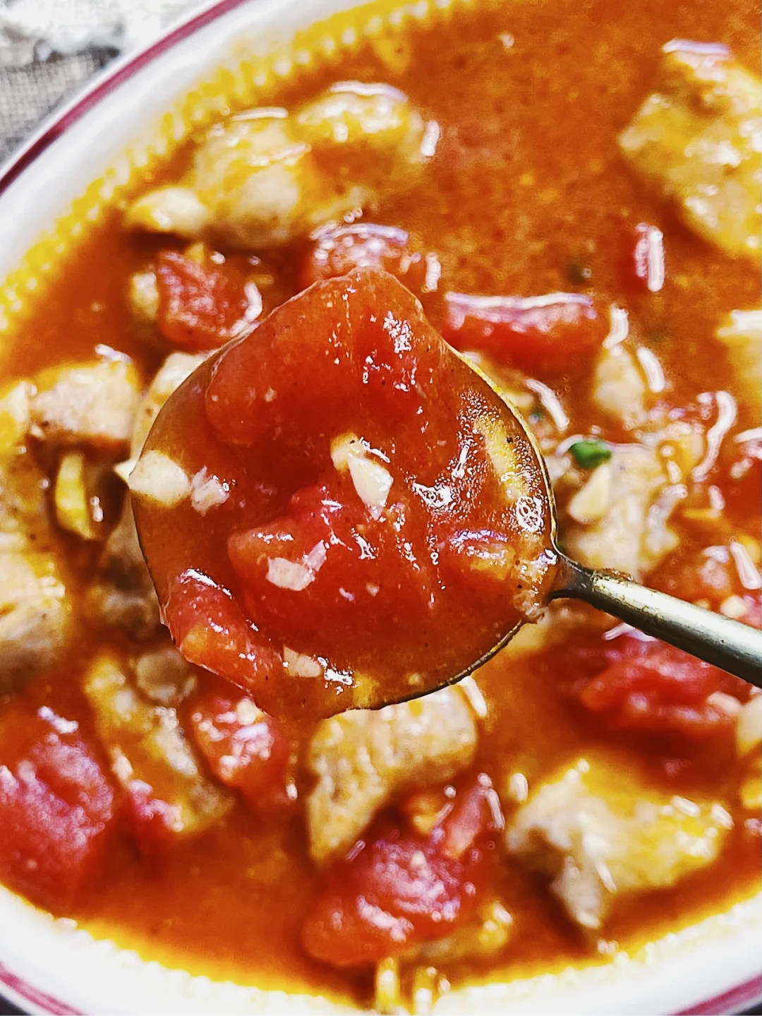 2️⃣西红柿画十字,放开水里烫到皮出褶皱,捞出去皮切小块,锅里倒油,放蒜末和姜丝翻炒出蒜香,倒入番茄继续翻炒出汁。