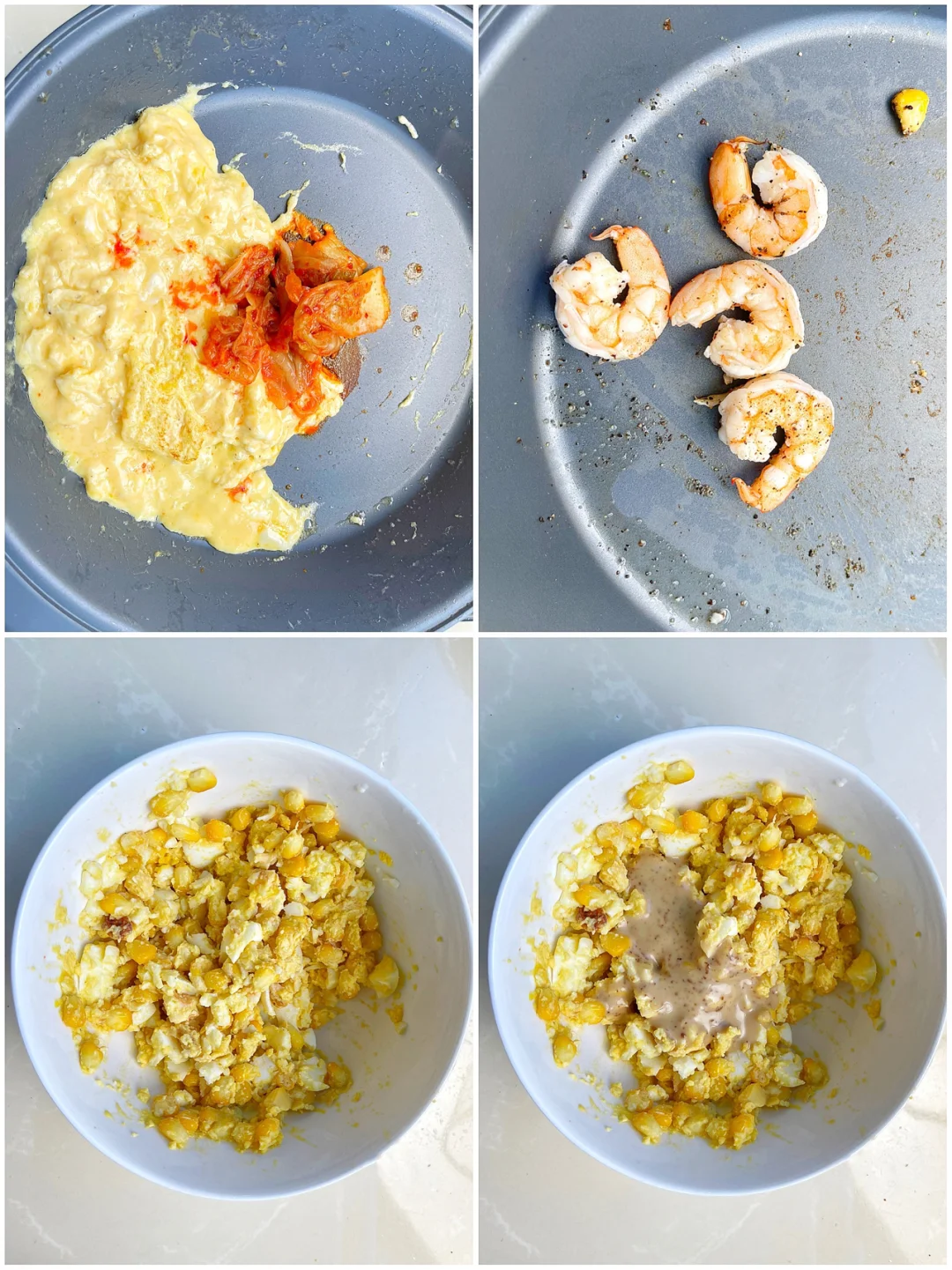 2个鸡蛋加少许牛奶搅拌均匀,倒入锅里,翻炒1min左右,在放入韩式泡菜,继续翻炒均匀。虾仁去皮去虾线,撒上黑胡椒,用小火煎熟