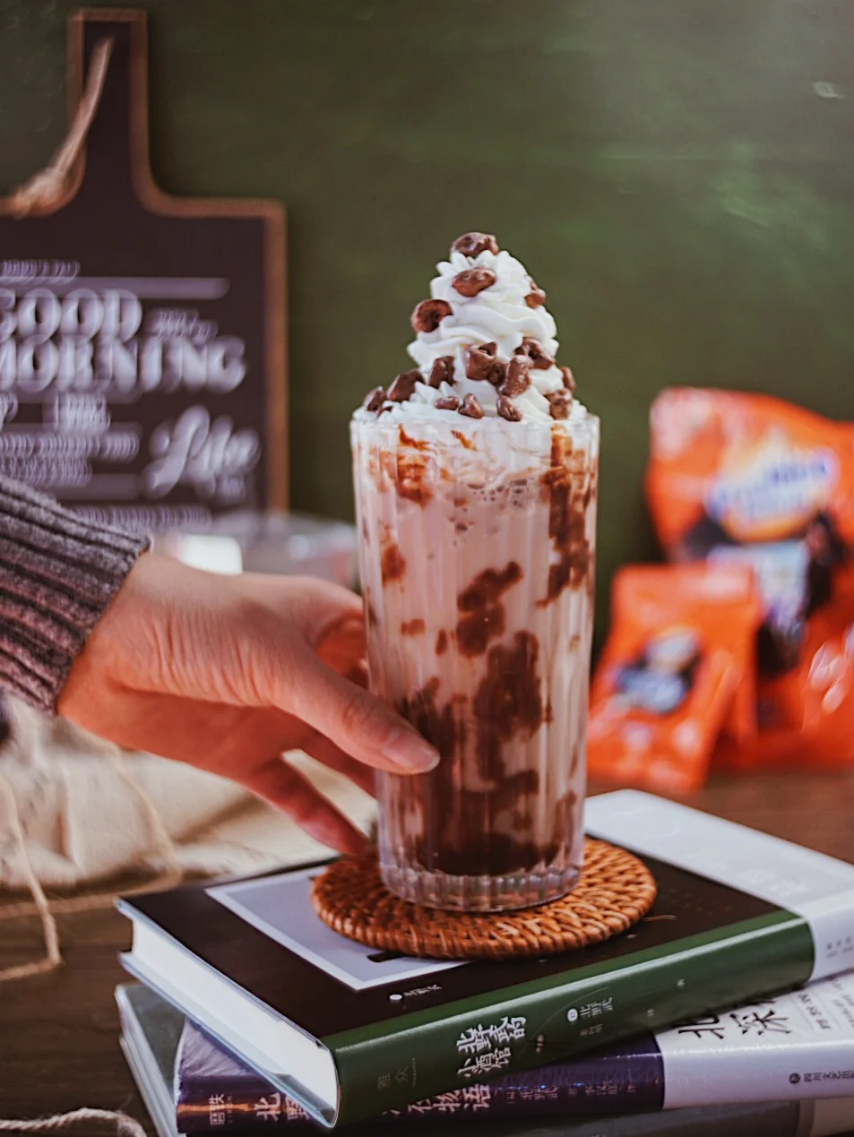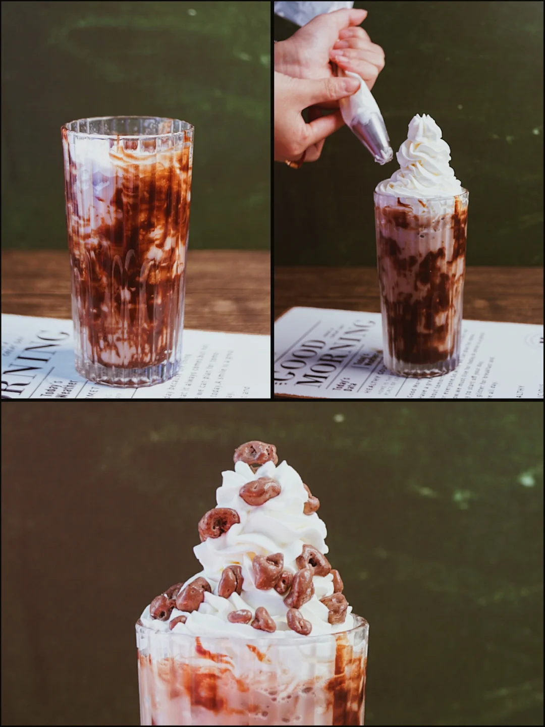 1️⃣先用酷脆酱抹杯,在把牛奶、冰块、糖浆、阿华田粉一起倒入破壁机里,打成沙冰。