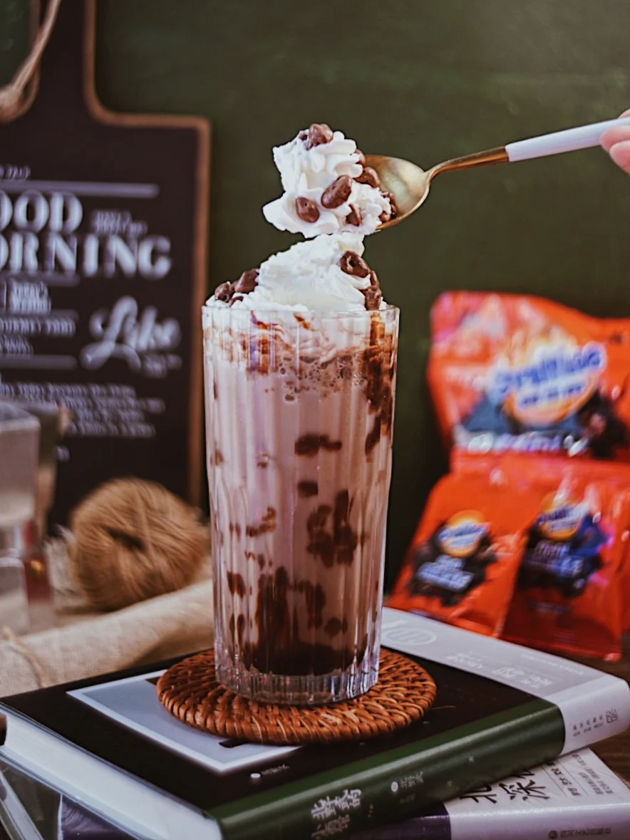 2️⃣阿华田mini酷脆星石倒入打好的沙冰里,翻拌均匀,一起倒入杯中。