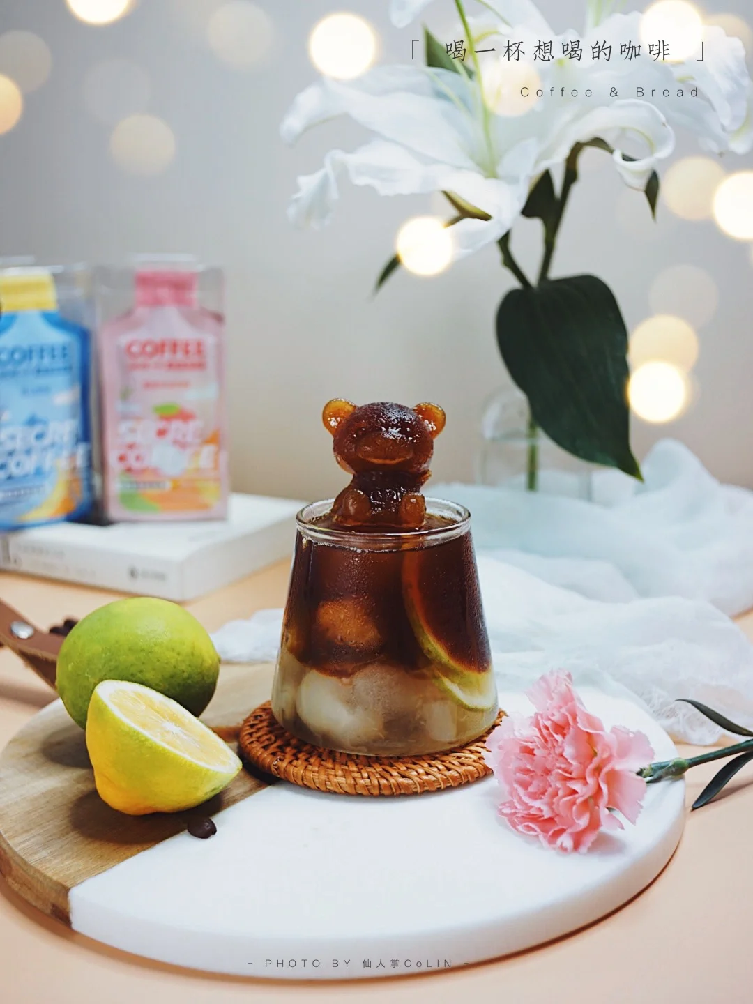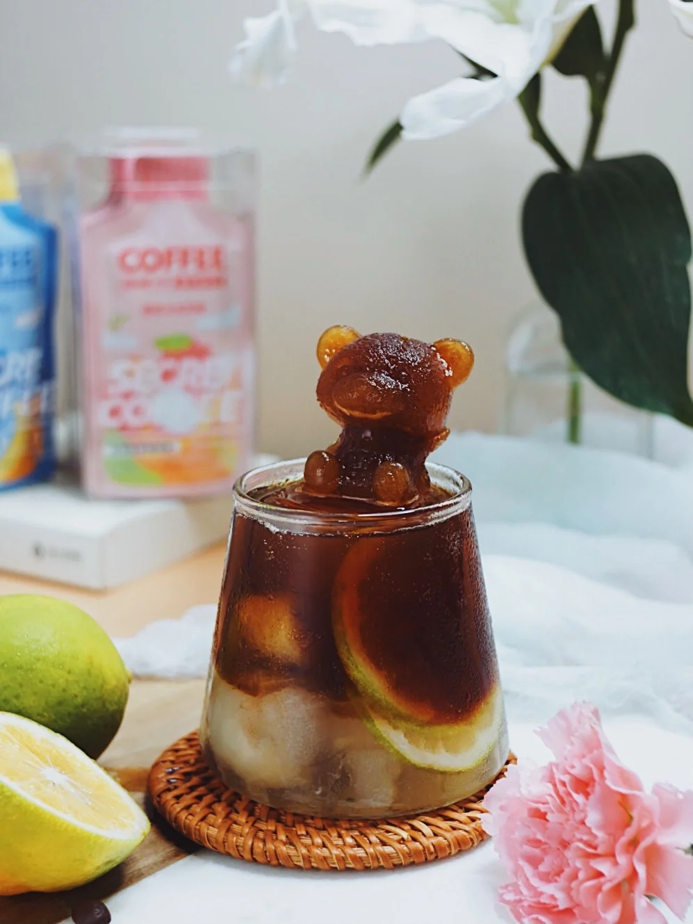 ·顶部放上脱模的小熊咖啡、倒入荔枝乌龙风味的时萃咖啡液