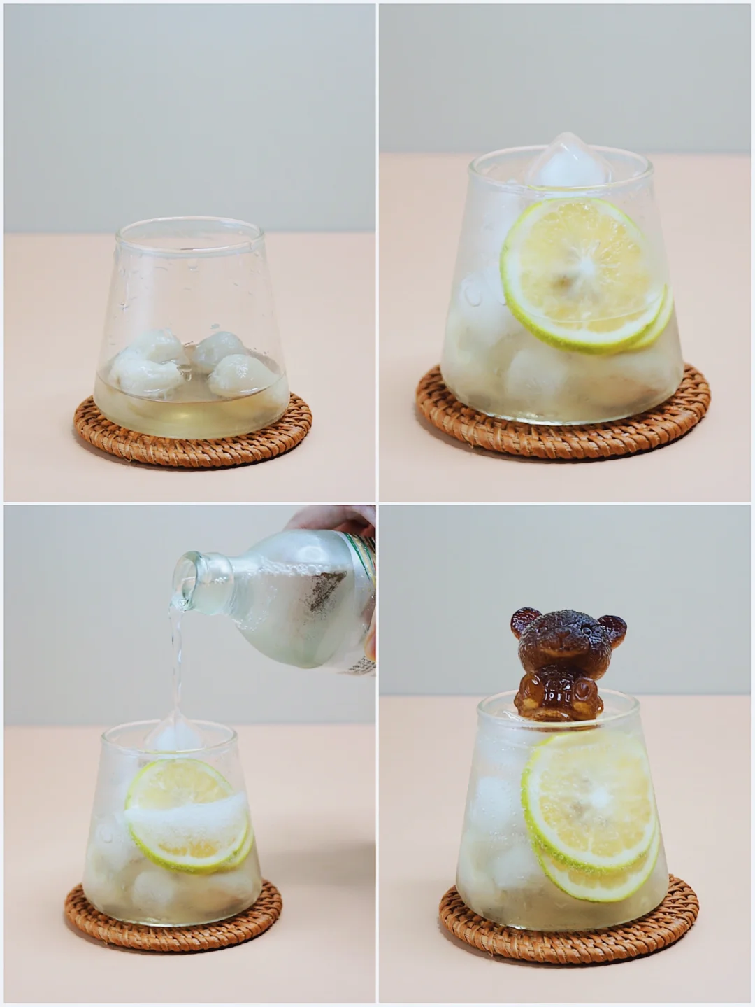 时萃咖啡液(荔枝乌龙风味、蓝山风味)各一袋 气泡水 青柠檬 荔枝酒40ml 小熊冰格模具 冰块适量