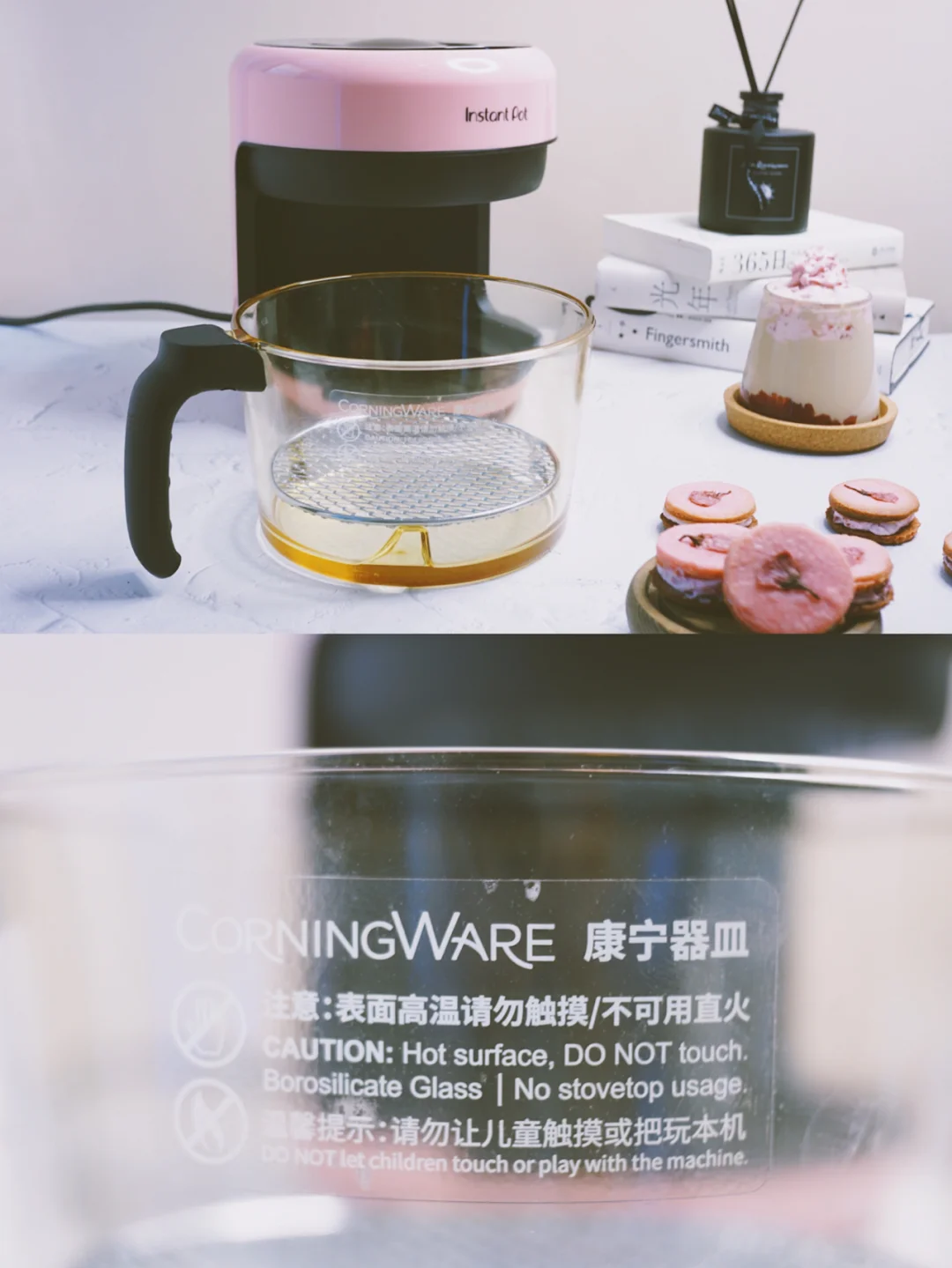 4️⃣放入康宁小心机空气炸锅里,设定为15分钟。淡奶油加细砂糖打发至裱花状态与草莓酱混合均匀。我用的这个instant pot透明空气炸锅是康宁玻璃的内胆,透明可视化的设计,能够随时观察食物的状态。内胆和机身是分离的,清洗起来也敲级方便哦