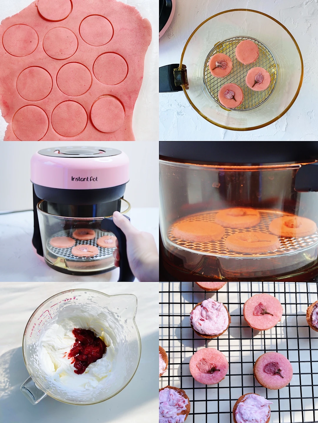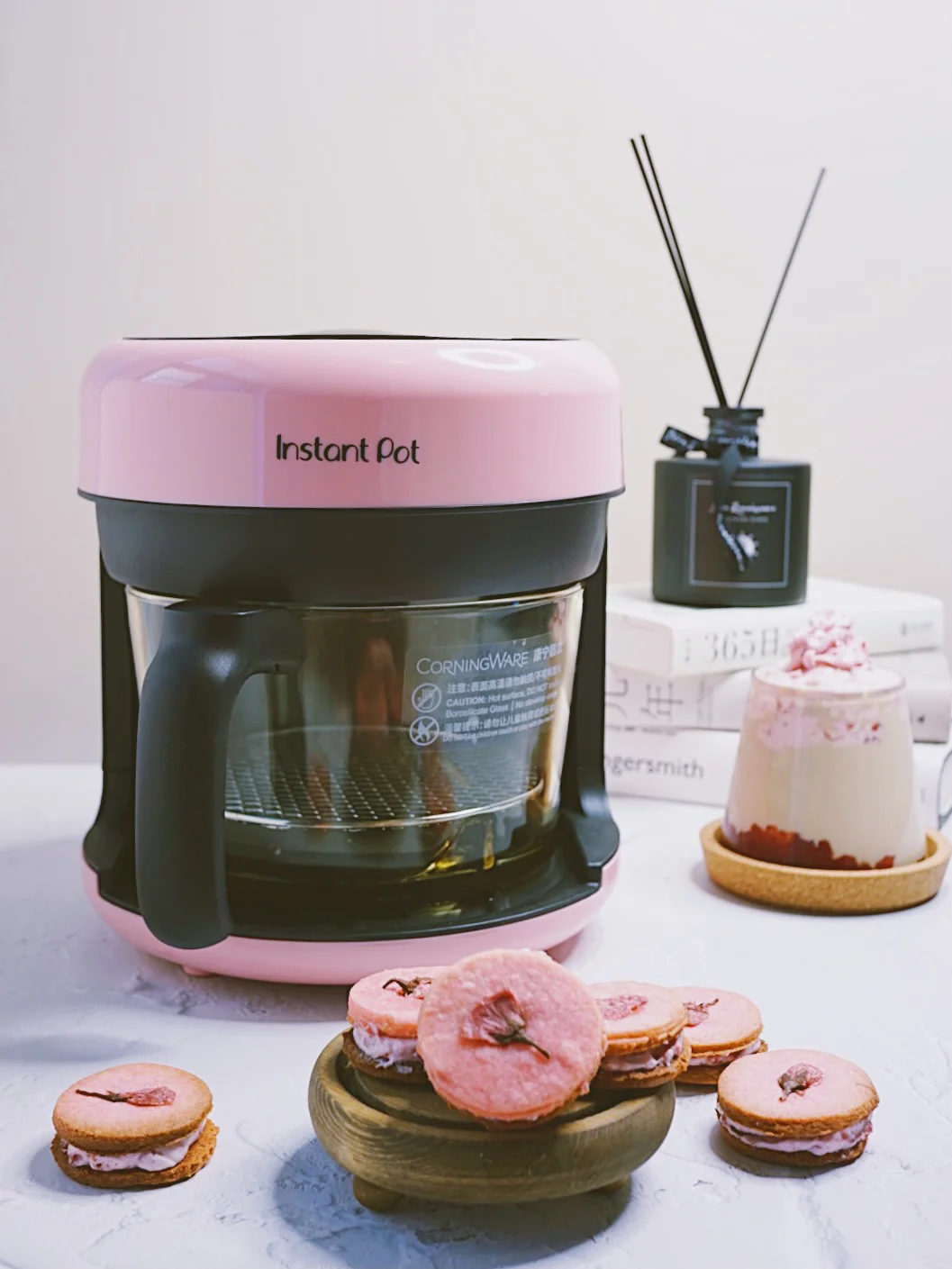 5️⃣容量是2L的,小巧不占地方,比较适合1-2人,用来做些下午茶小糕点。360°循环空气加热,还可以用来炸鸡翅、红薯神马的,太好吃啦。烤好的饼干,其中一片抹上草莓酱,盖上另一片樱花饼干,放冰箱冷藏30分钟左右就好啦。