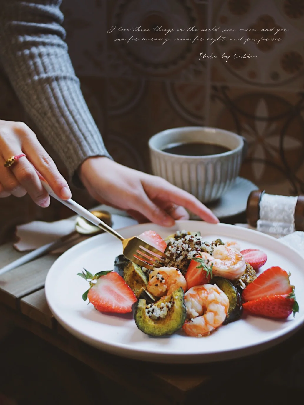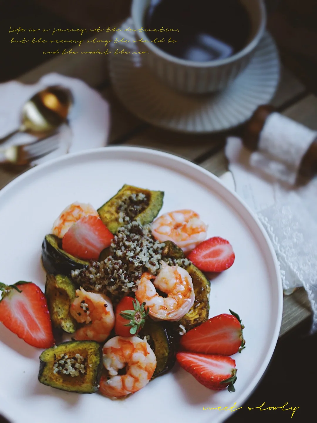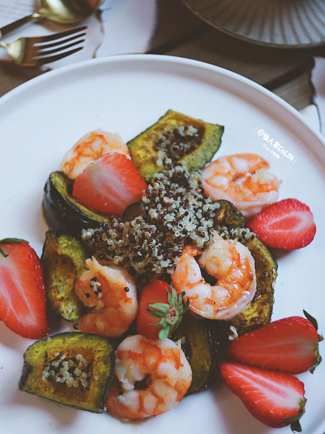 4️⃣最后,把烤好的南瓜、藜麦、基围虾和草莓进行摆盘