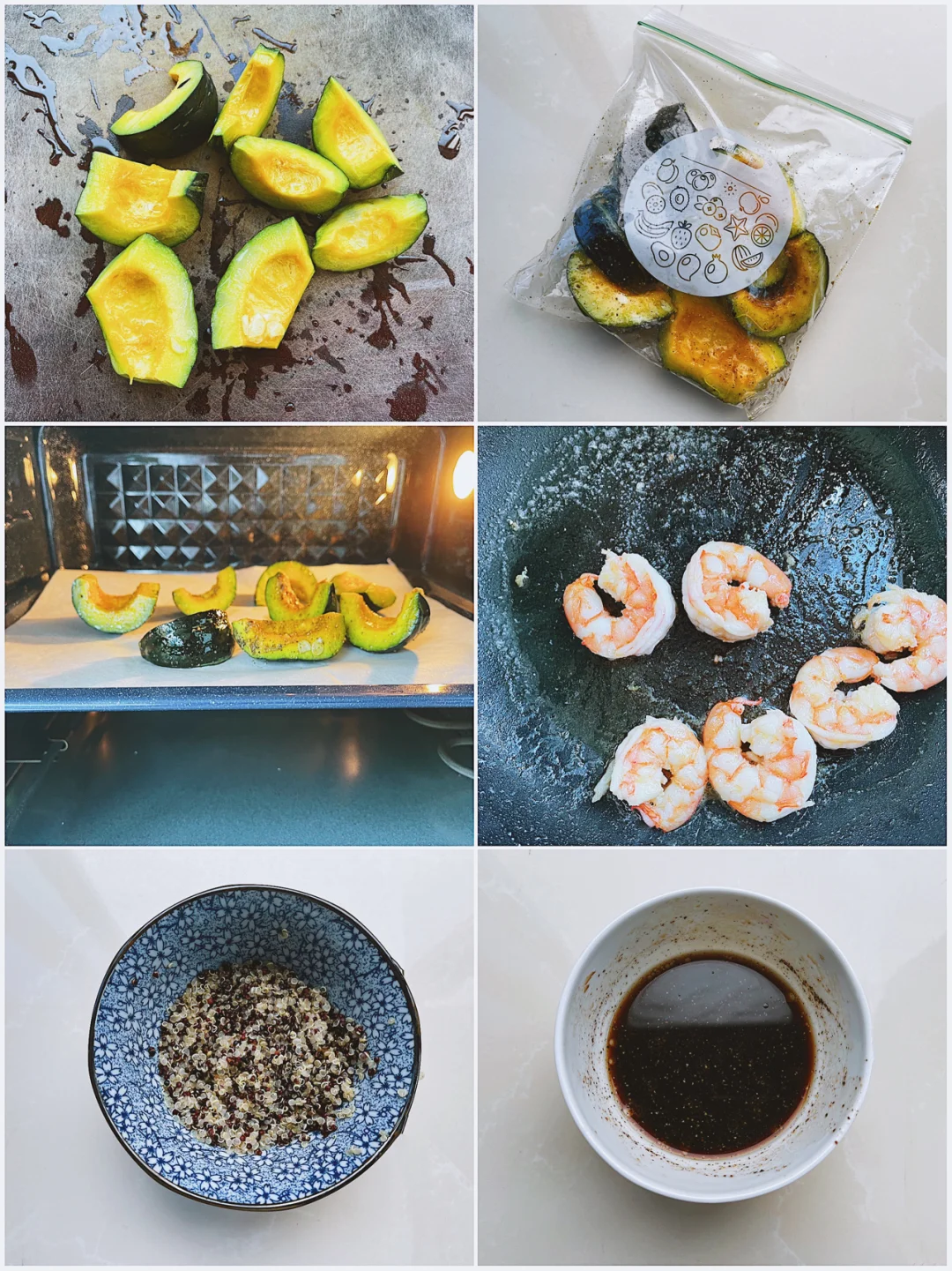 经过烘烤后的南瓜,口感绵软,搭配健身人士爱吃的三色藜麦,蛋白选择了百吃不厌的基围虾。