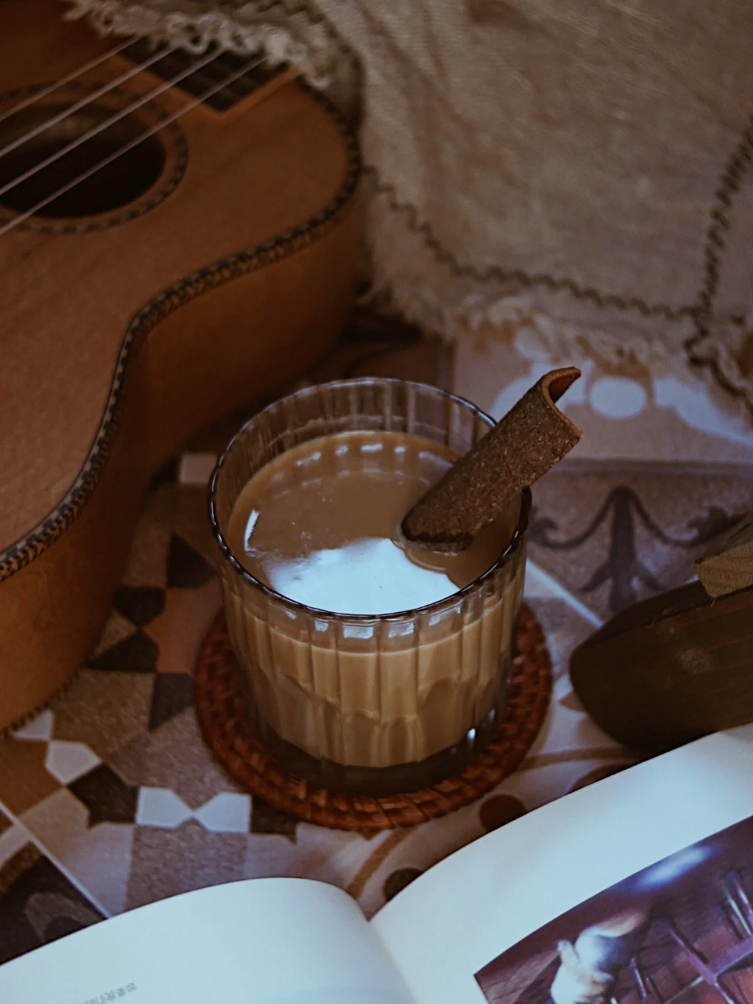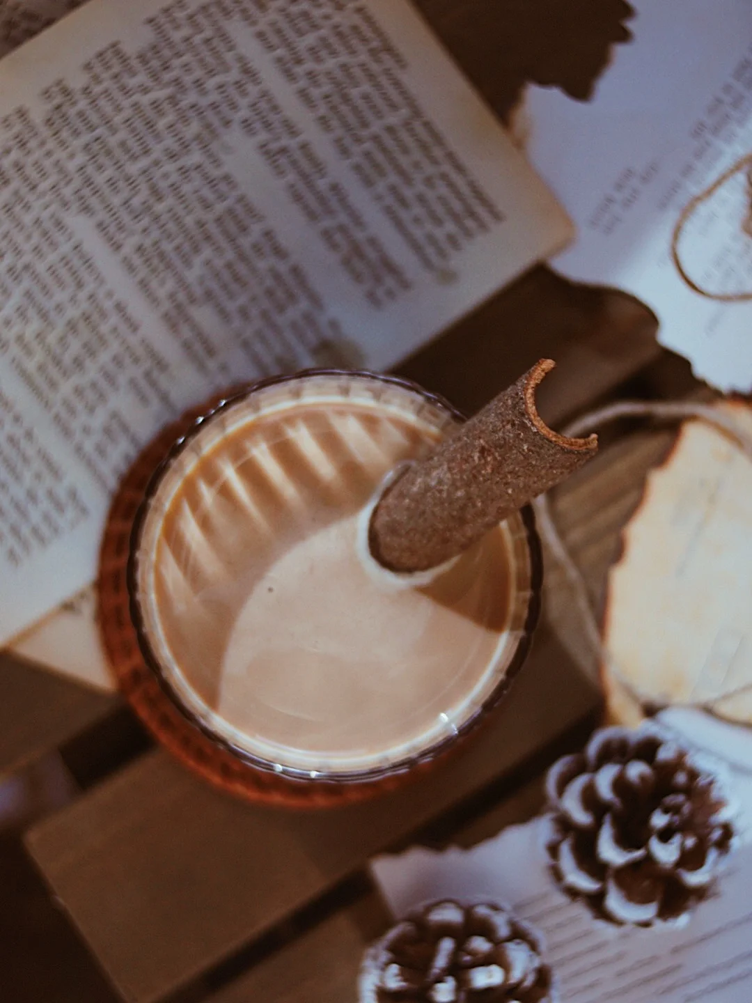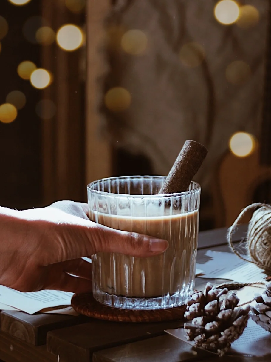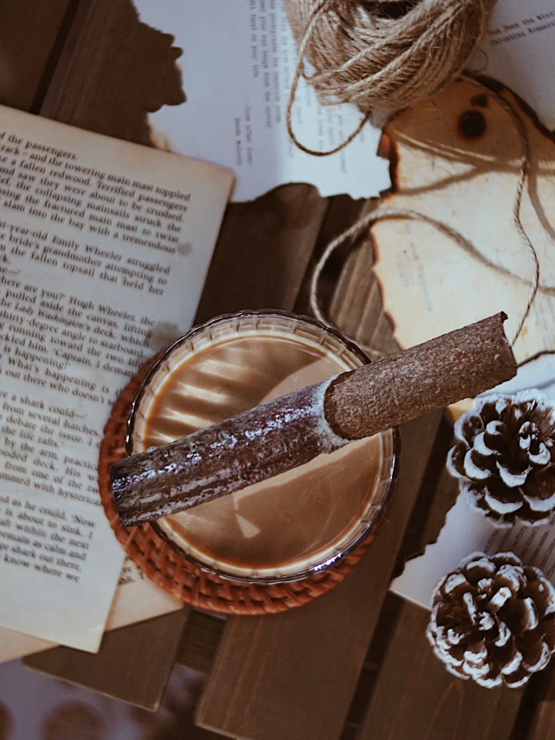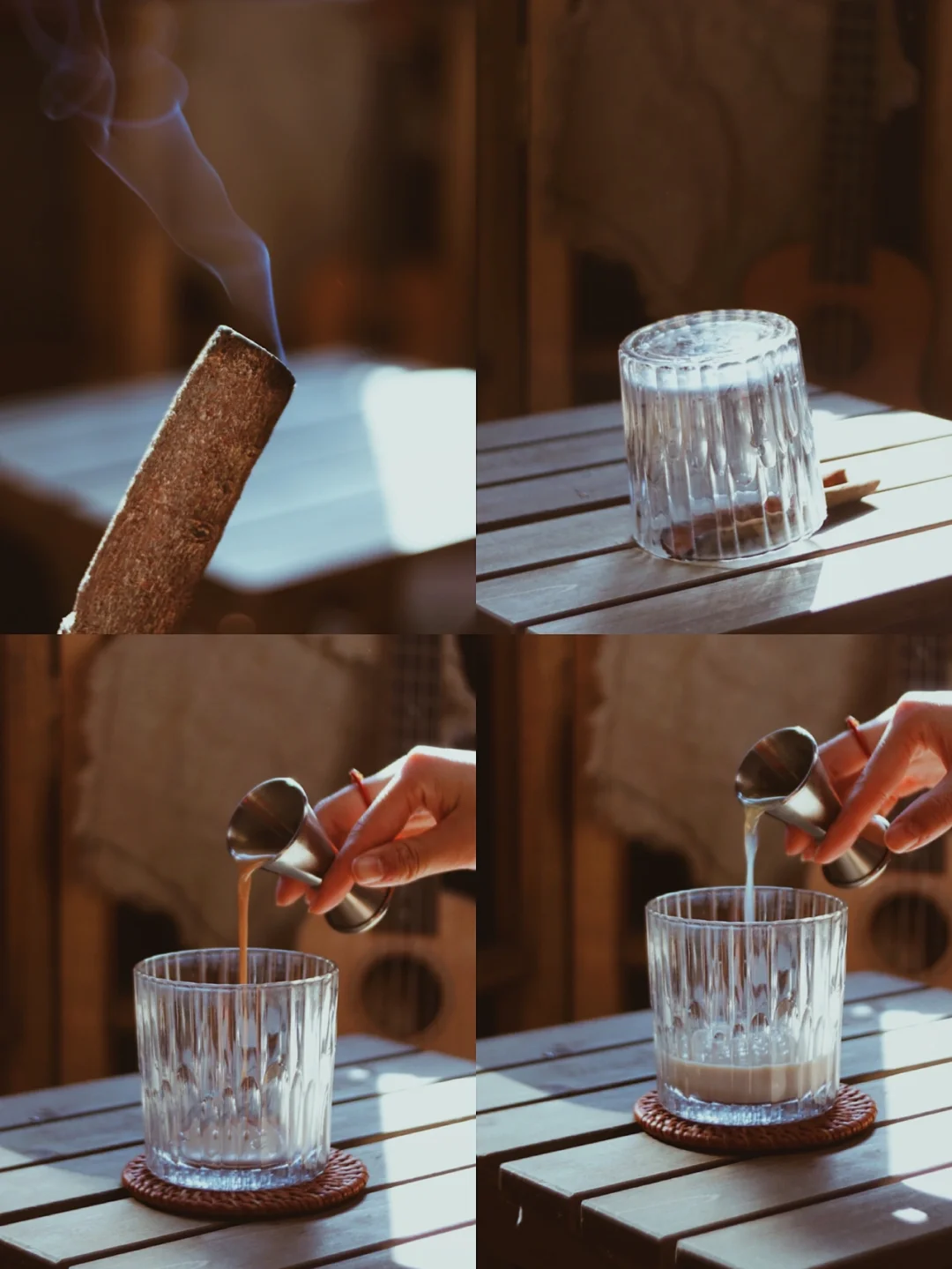 ©️肉桂棒用火点燃,冒烟。马克杯放冰箱冷藏至起白雾,倒扣在肉桂上