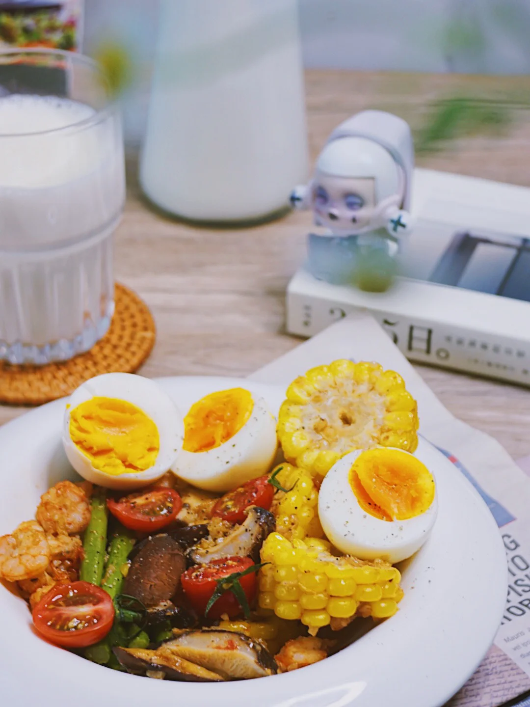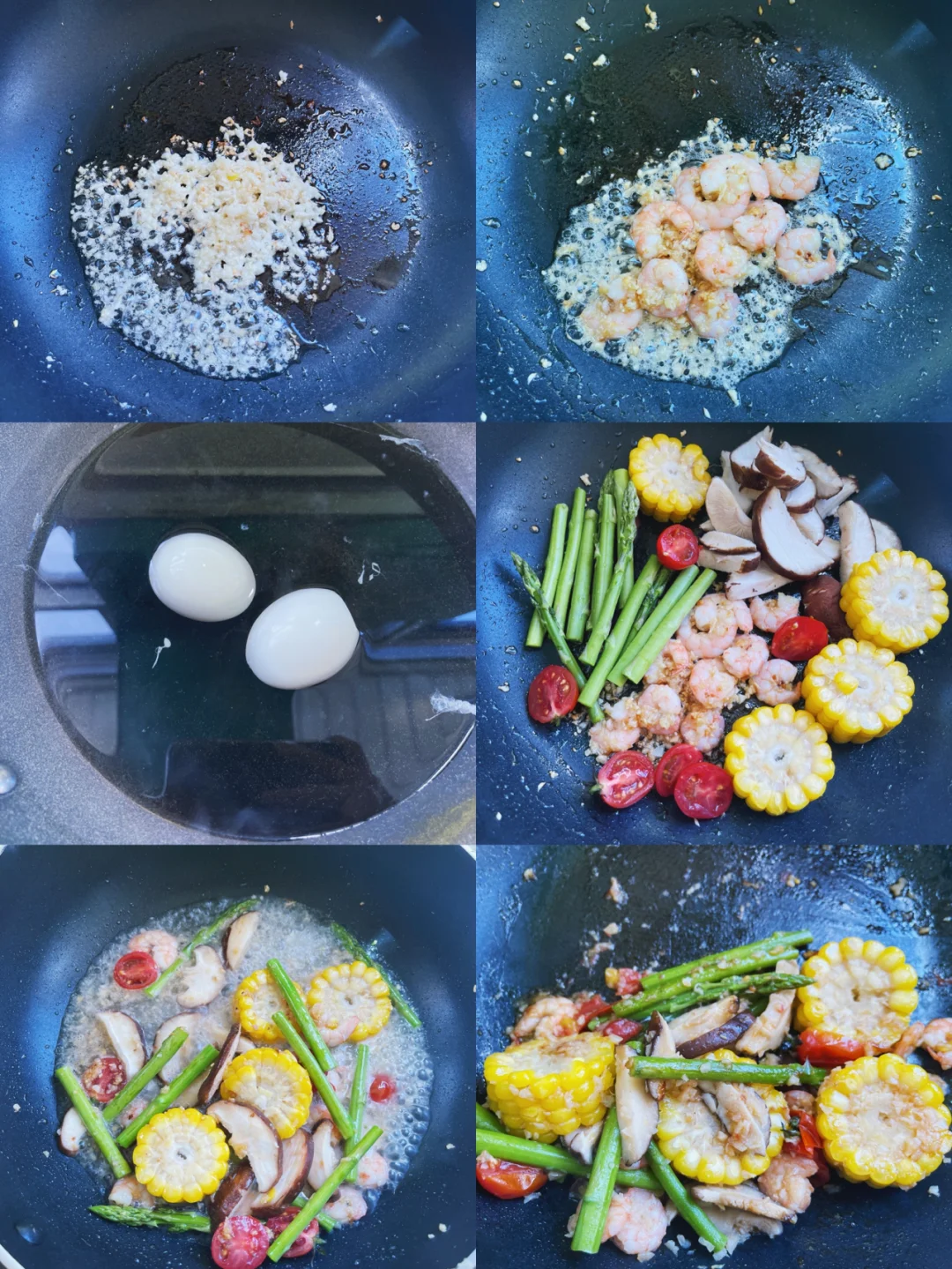 基围虾、玉米、鸡蛋、圣女果、芦笋、香菇