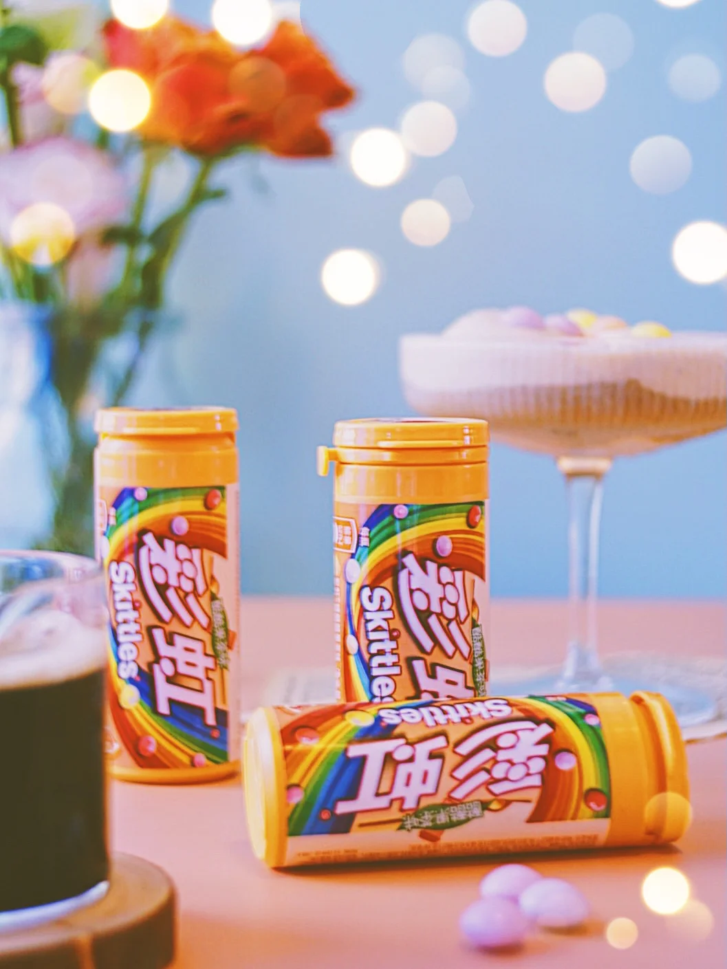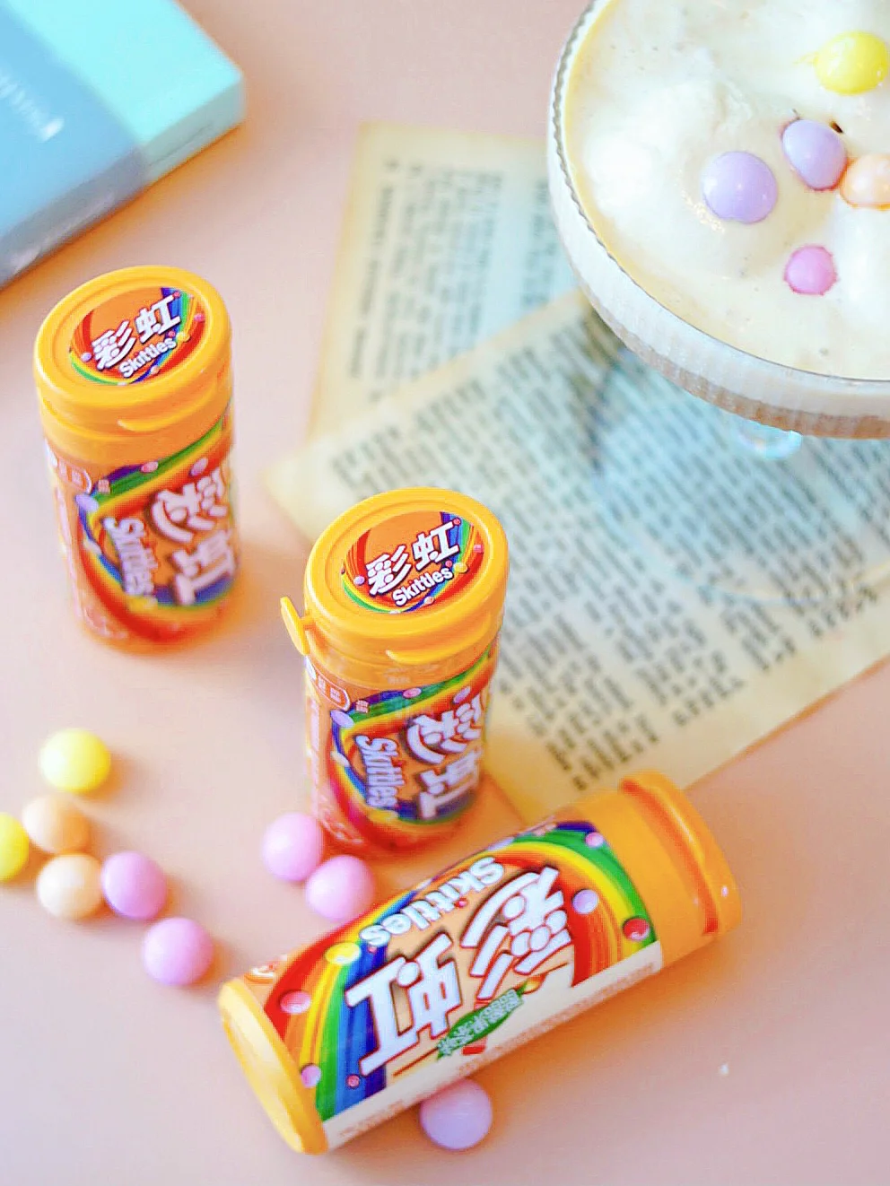 表面用到的酷酷果茶味彩虹糖,一共有5种果茶口味,不同口味对应的颜色也不一样🍭咬开彩虹糖脆脆的糖果外皮,里面就是软糯有嚼劲的软糖,连呼出的空气里,都被茶香和果香🍊紧紧包裹。一点也不腻。我入的罐装的,装在包里或者放在电脑边,想吃的时候随时来两颗。