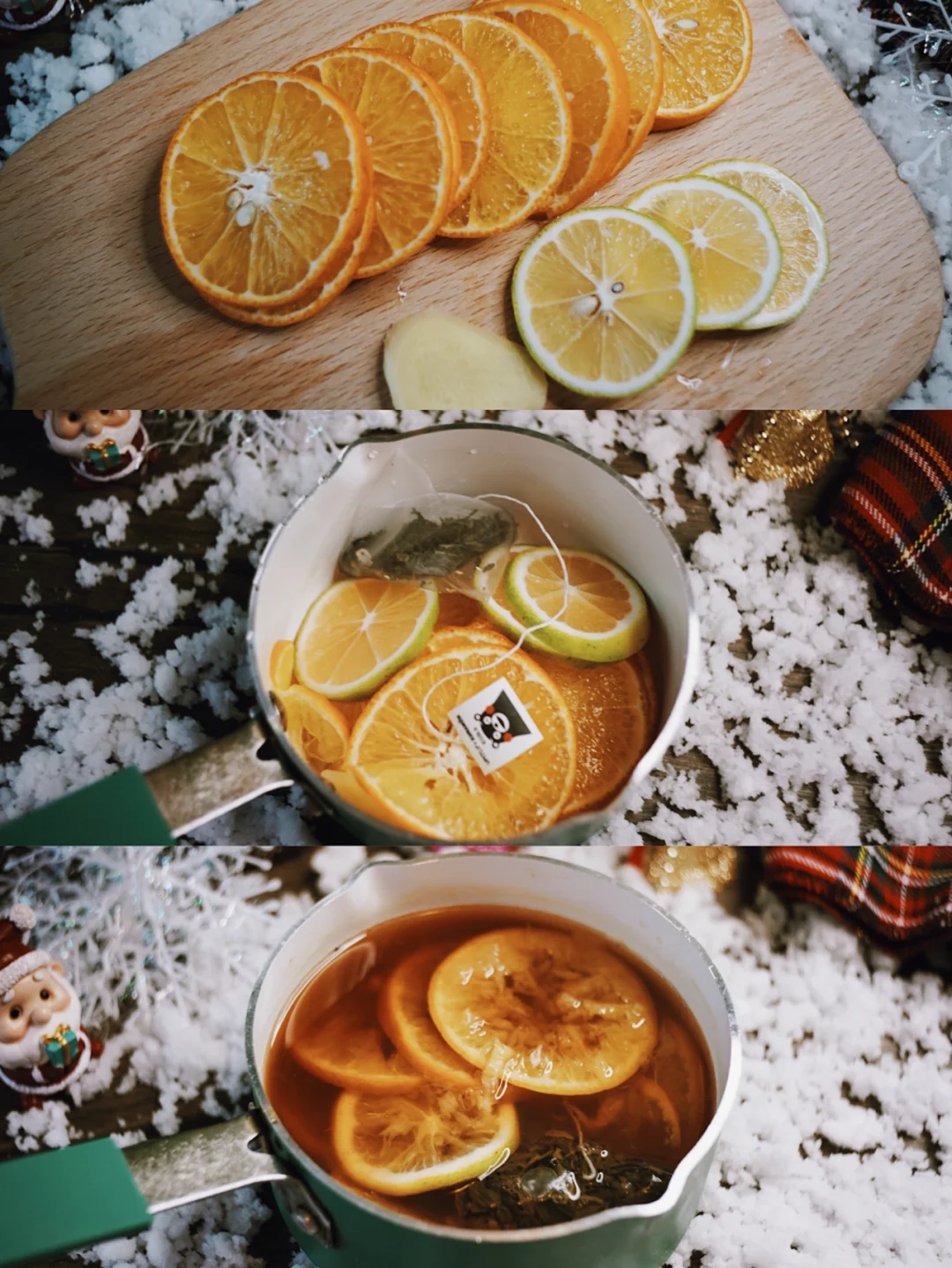 2️⃣依次把橙片、柠檬片、生姜放入奶锅里,倒入开水和葡萄茶包
