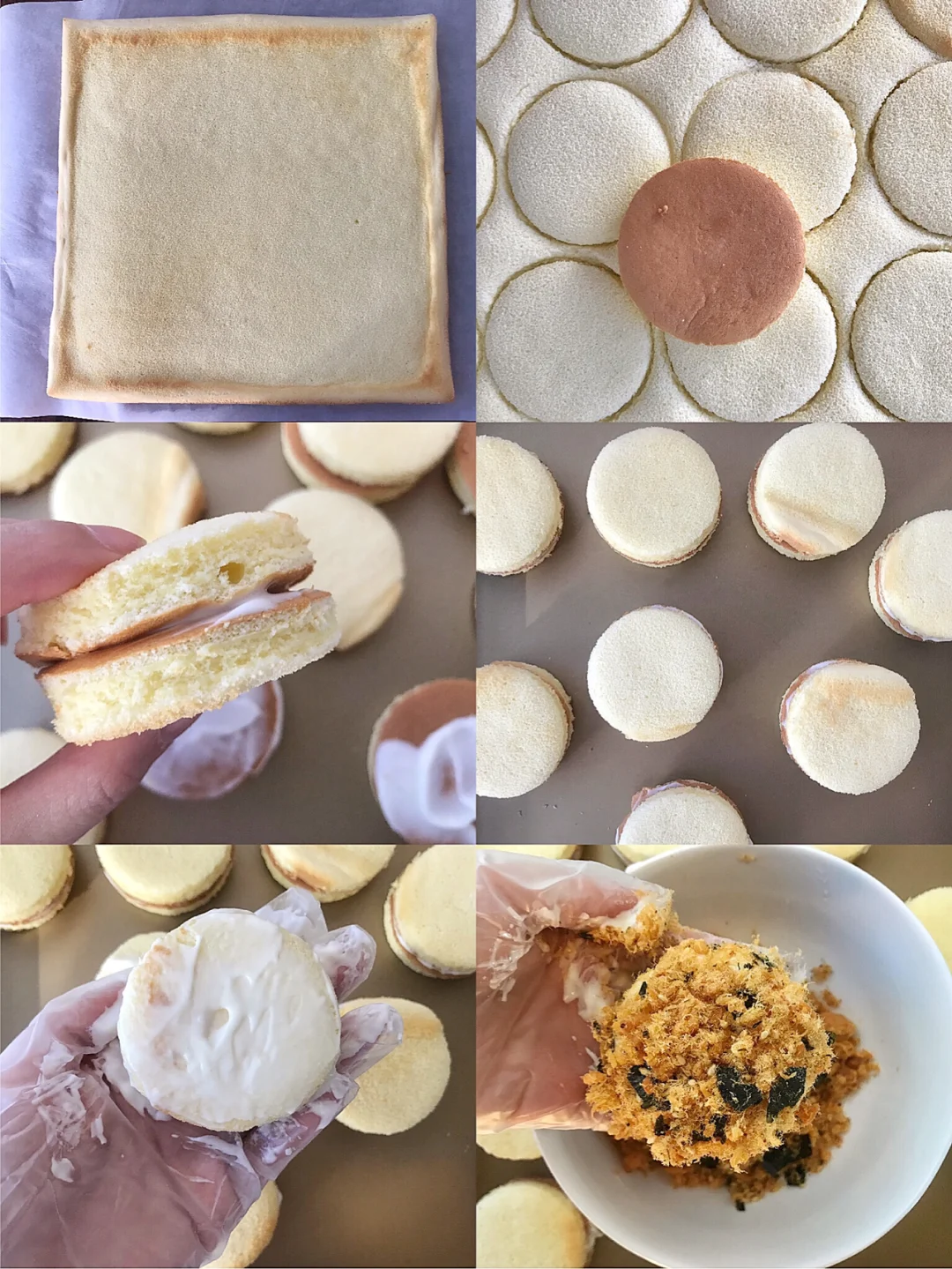 6️⃣烤好的蛋糕胚倒扣晾凉,压出5cm左右的小圆片,取2片蛋糕片,中间抹上沙拉酱,粘起来,外面也抹一圈沙拉酱,蘸满肉松海苔。