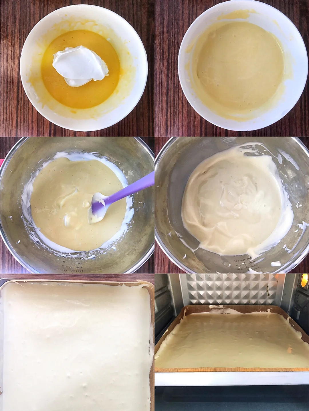 4️⃣打发好的蛋白霜,取1/3与蛋黄糊翻拌均匀在倒入剩下的蛋白霜,用刮刀翻拌均匀以后倒入烤盘中,抹平,震出气泡。
