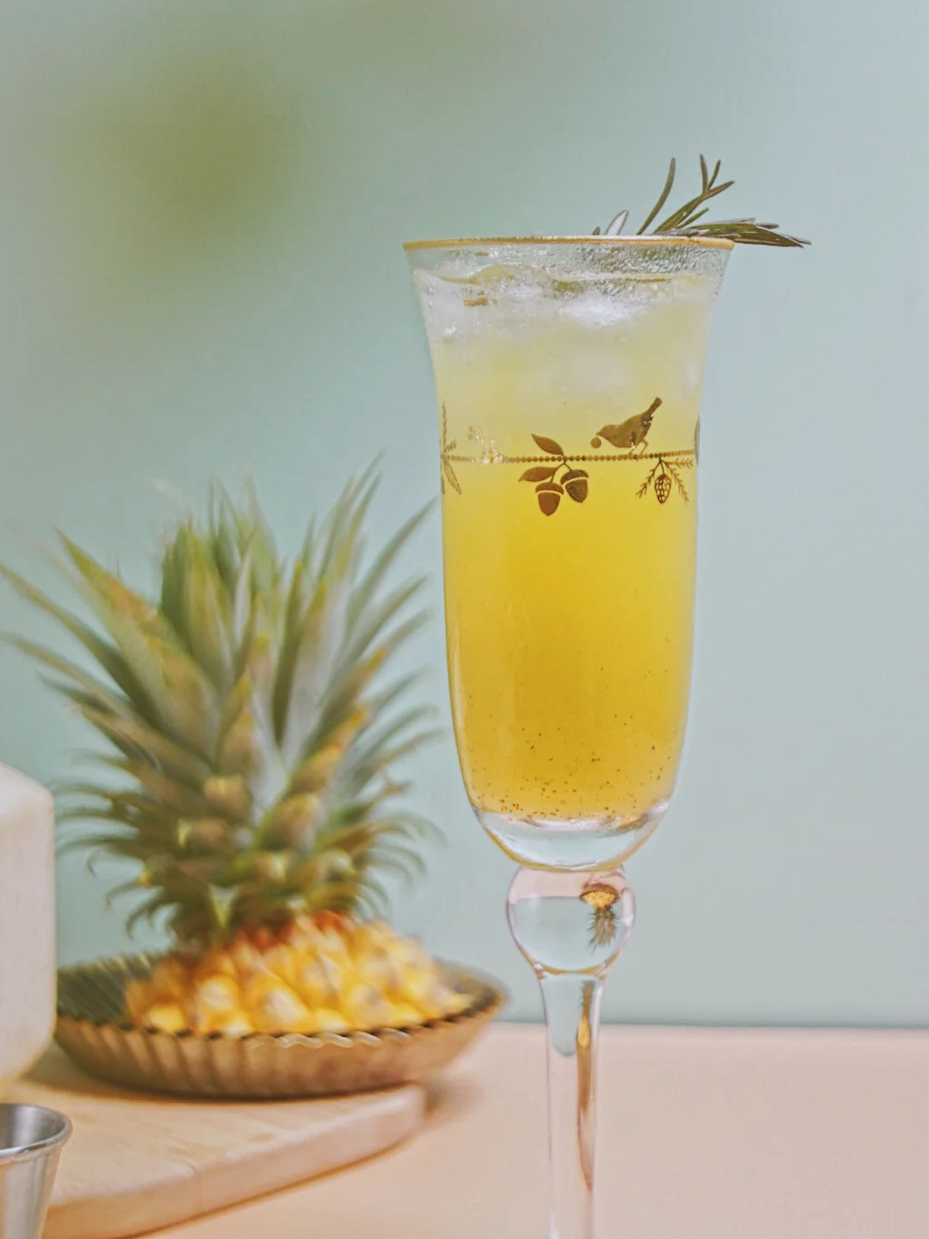 ● 菠萝去皮切块榨成汁,倒入香槟杯中,冰块放置7分满,再倒入椰子水和猕猴桃朗姆酒