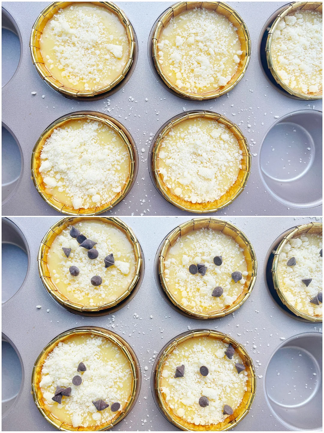 4️⃣倒入纸杯8分满,表面撒上适量的酥粒和巧克力豆,放入烤箱180度烤25分钟。