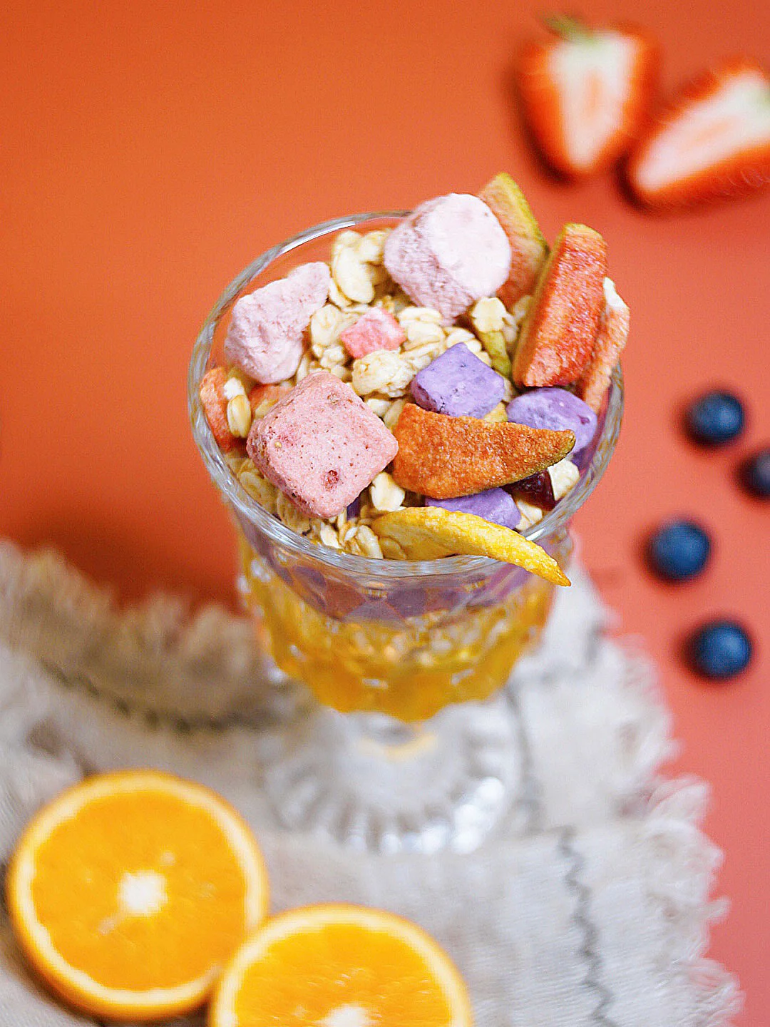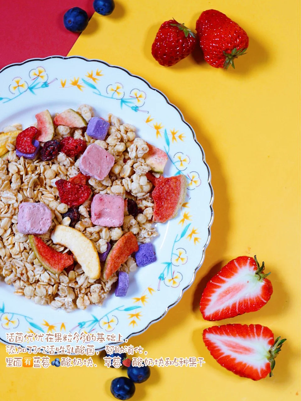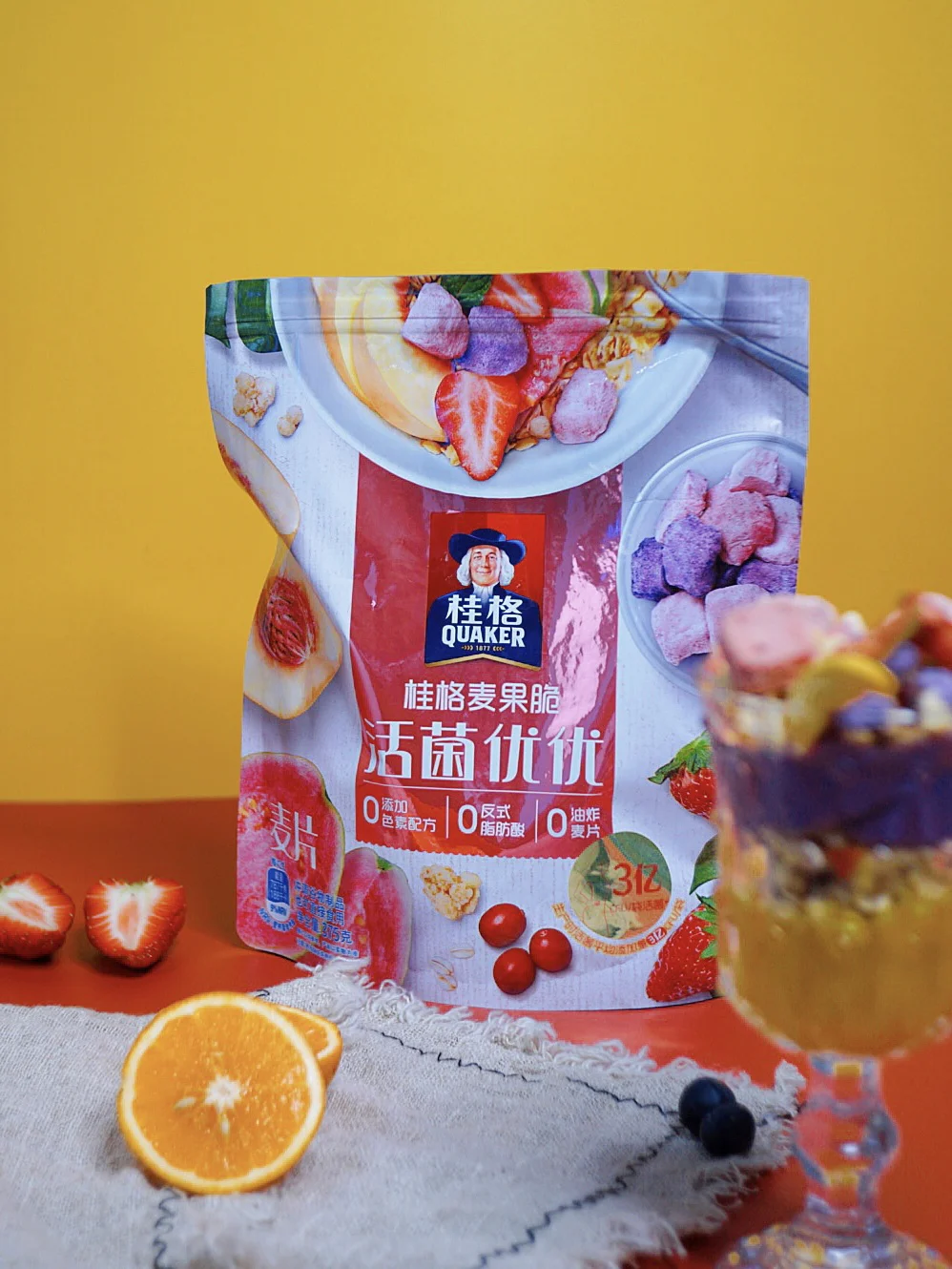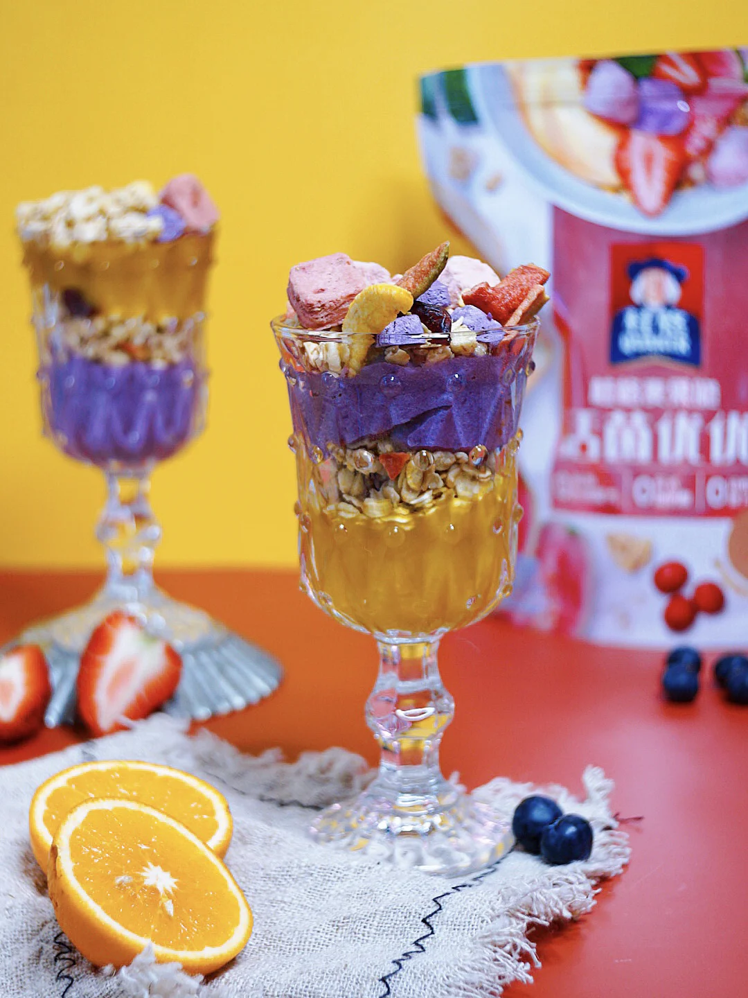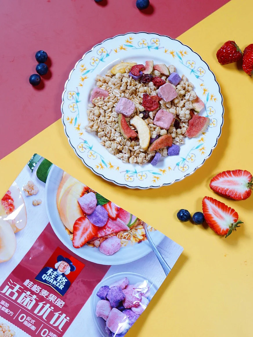 我做的这款芭菲杯里用到的是桂格麦果脆,选用的澳洲进口阳光燕麦🌾非油炸,而且是不含反式脂肪酸、0添加色素配方,一份热量小于两个苹果🍎口感是那种酥脆带有嚼劲的。我用到的这款是活菌优优,可以开袋即食,里面添加了3亿活性乳酸jun🍼可以帮助消化,里面有肉眼可见的超大蓝莓🫐酸奶块和草莓🍓酸奶块,入口即化,还有超多的红心番石榴🍉脆片、黄桃🍑脆片、草莓🍓脆片等多种果干[赞R]