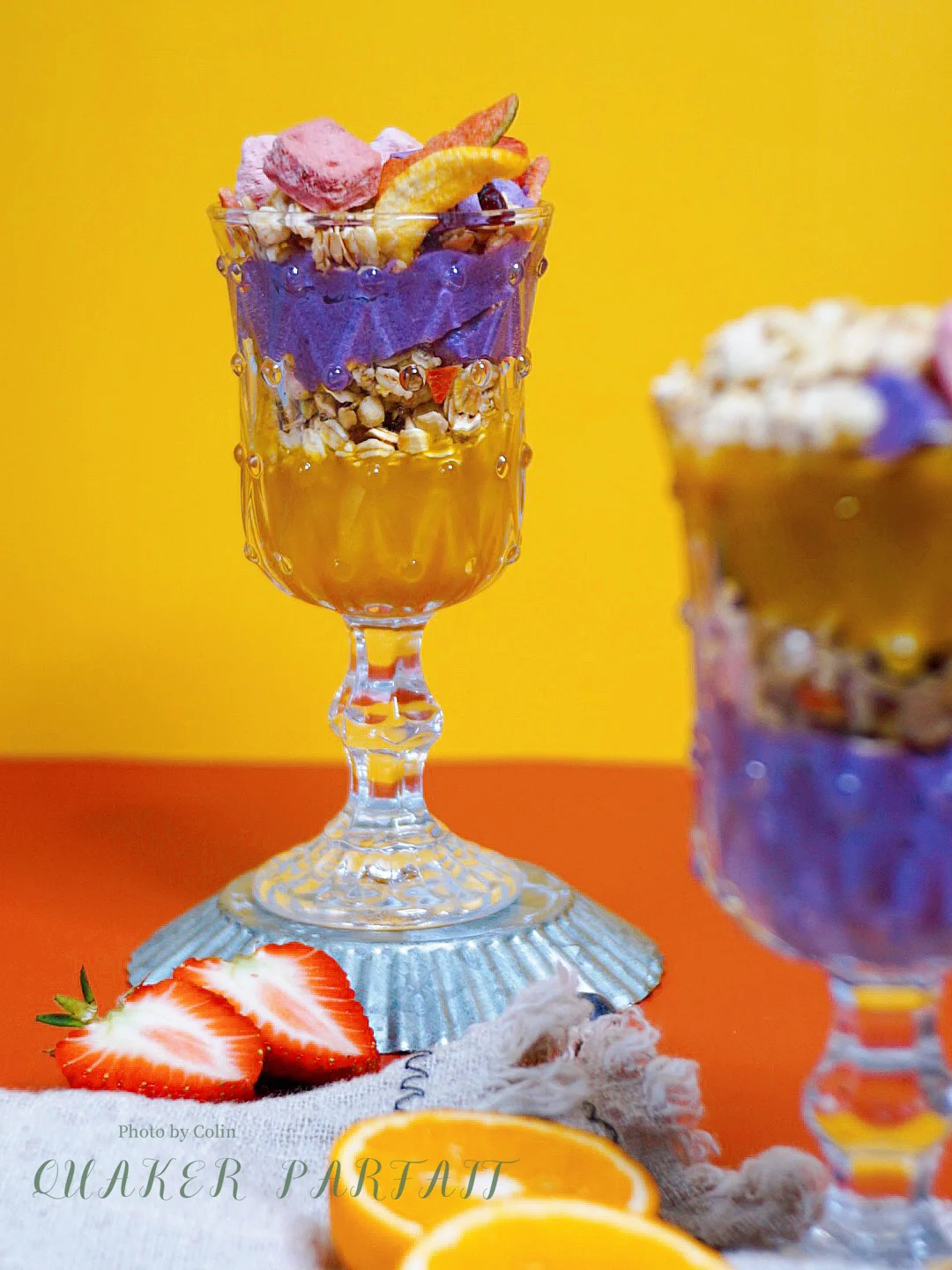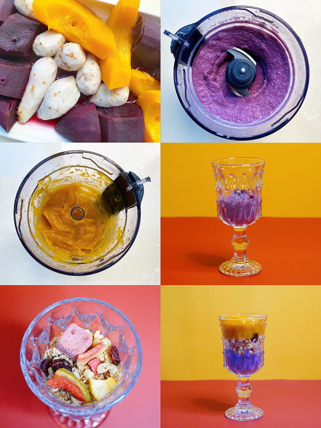 3️⃣杯中按照一层芋泥,一层麦果脆,一层南瓜的顺序铺好,最后,铺上一层麦果脆,摆上里面的果干就好啦
