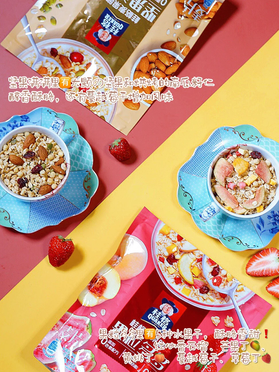 反正每天都是要吃的,我索性把另外两款口味果粒多多和坚果满满都入了。坚果满满里面有大颗的扁桃仁🥜和南瓜籽仁,还有蔓越莓干,营养配比这一块,拿捏的准准的。