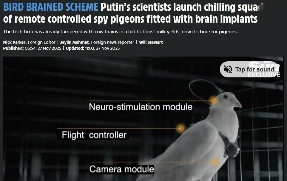 英国《太阳报》报道称,俄罗斯正在使用“遥控间谍鸽中队”对欧洲实施侦察。 该报称,俄罗斯已经使用了基于鸽子的PJN-1“生物无人机”,配备了脑植入电机、机载电子设备、GPS追踪系统和接收器的微型太阳能背包,听起来有点离谱。
