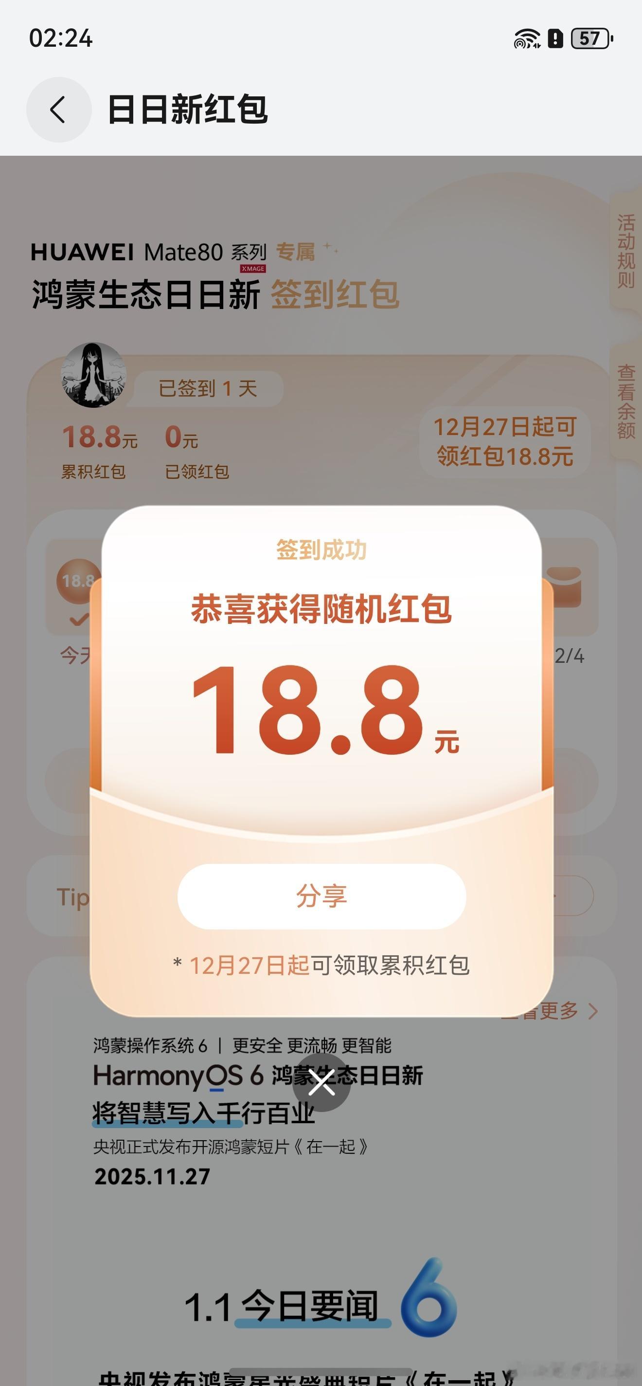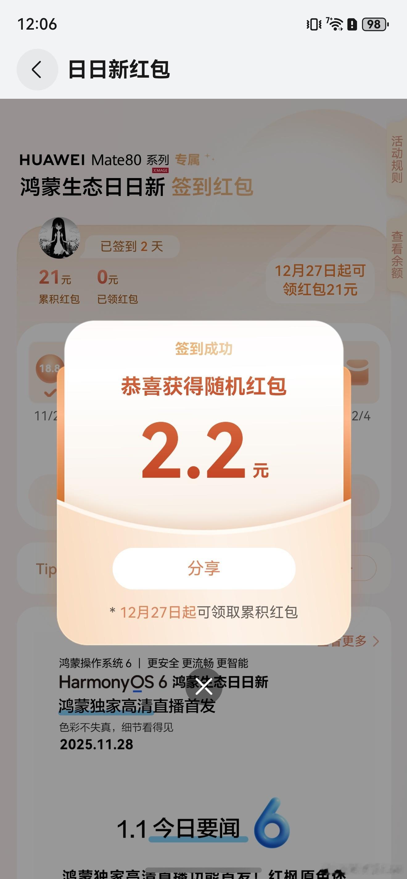 华为Mate 80 Pro Max的日日新红包,第二天签到,领了2.2元,第一天签到也就18.8……我就想问问,你们那些八九十块钱的,是怎么领出来的!?还有人比我更低吗?