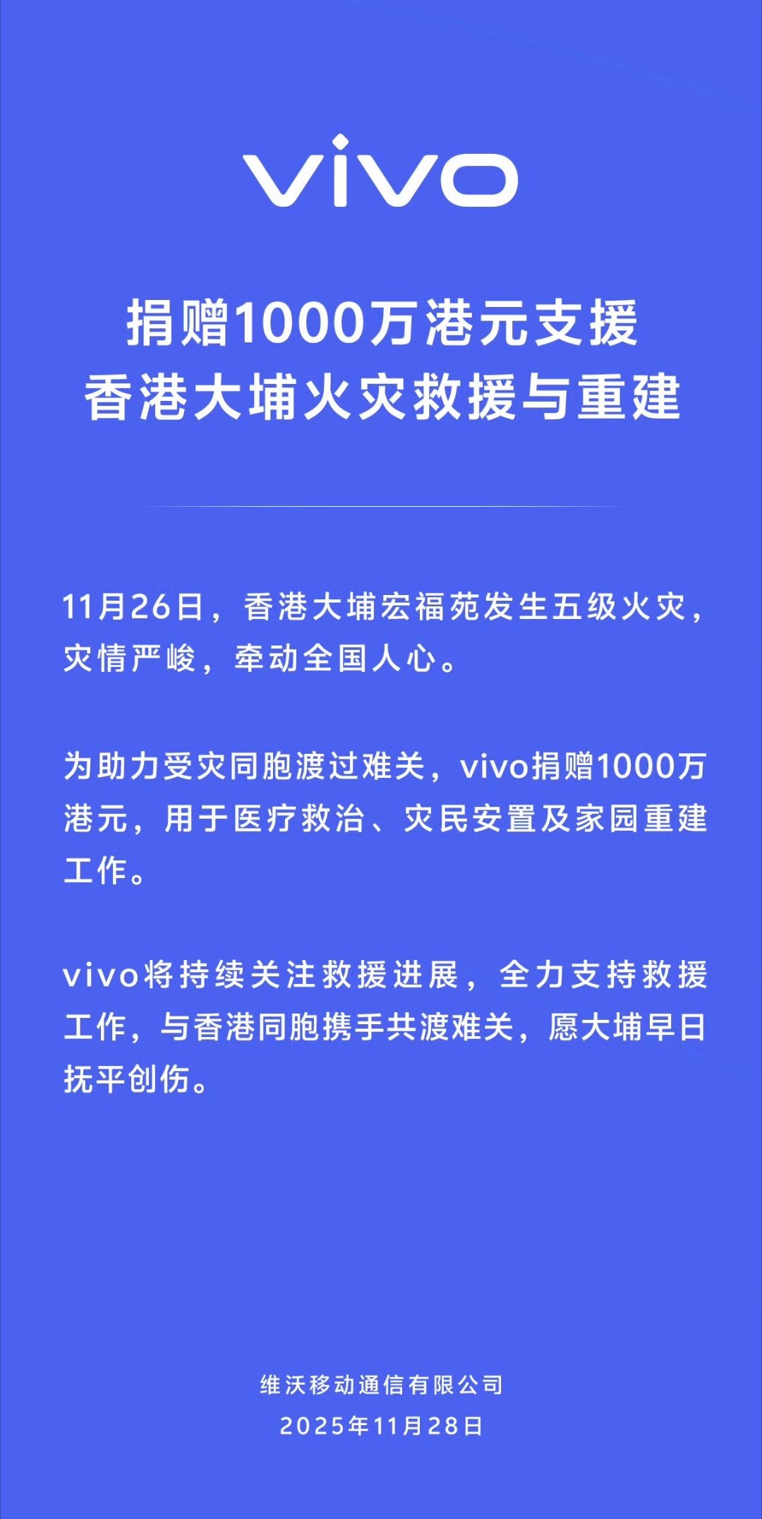 【vivo 捐赠 1000 万港元支援香港大埔火灾救援与重建】香港大埔宏福苑发生五级火灾,灾情严峻,牵动全国人心。为助力受灾同胞渡过难关,vivo 捐赠 1000 万港元,用于医疗救治、灾民安置及家园重建工作。vivo 称,将持续关注救援进展,全力支持救援工作,与香港同胞携手共渡难关,愿大埔早日抚平创伤。11 月 28 日,香港特区政府保安局局长邓炳强在发布会上说,香港大埔火灾已致 128 人遇难,79 人受伤。