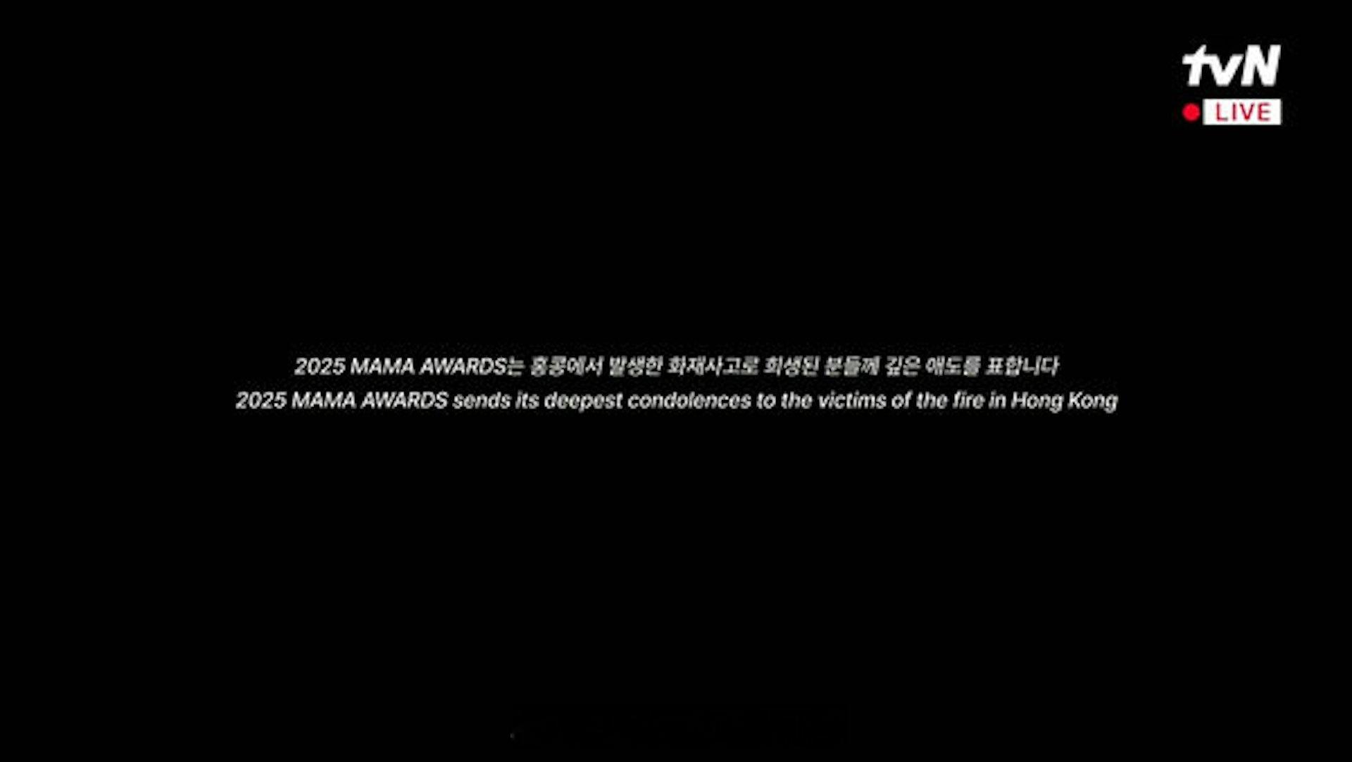 香港01:宏福苑大火|朴宝剑MAMA全身黑 眼红红哀悼:希望不再有更多伤亡大埔宏福苑大火引起众多伤亡,今日(11月28日)2025 MAMA Awards于香港举行,事前大会紧急修改主题,并抽起烟火环节。2025 MAMA Awards如期于网上直播,朴宝剑以全身黑装束现身,致词表达哀悼。朴宝剑:"大家好,我是MAMA主持人朴宝剑,MAMA睽违7年回到香港,许多人等了这天很久,但很遗憾的是,有一件重大伤亡事件发生,这个事件造成有人失去珍贵的生命又或者失去珍贵的朋友与家人,在此致上最高哀悼之心,希望不再有更多伤亡,让我们先做短暂地闭眼默念。"此外,于今晚节目开始前,大会也特别打上"2025 MAMA AWARDS 对于在香港火灾事故中罹难的人们致上深切哀悼。"