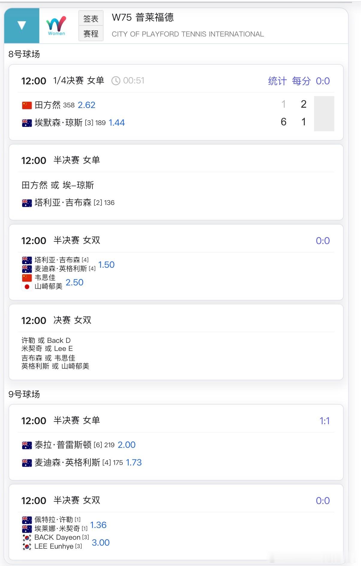 🔵W75普莱福德11月29日赛程🇨🇳田方然补赛如果逆转需要一日双赛🇨🇳韦思佳女双也是网球talking大会 丨中国网球