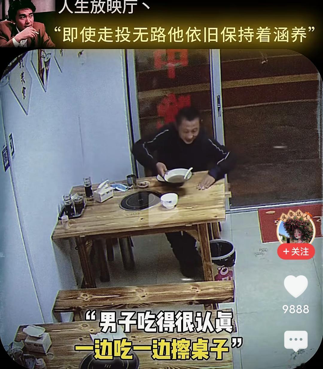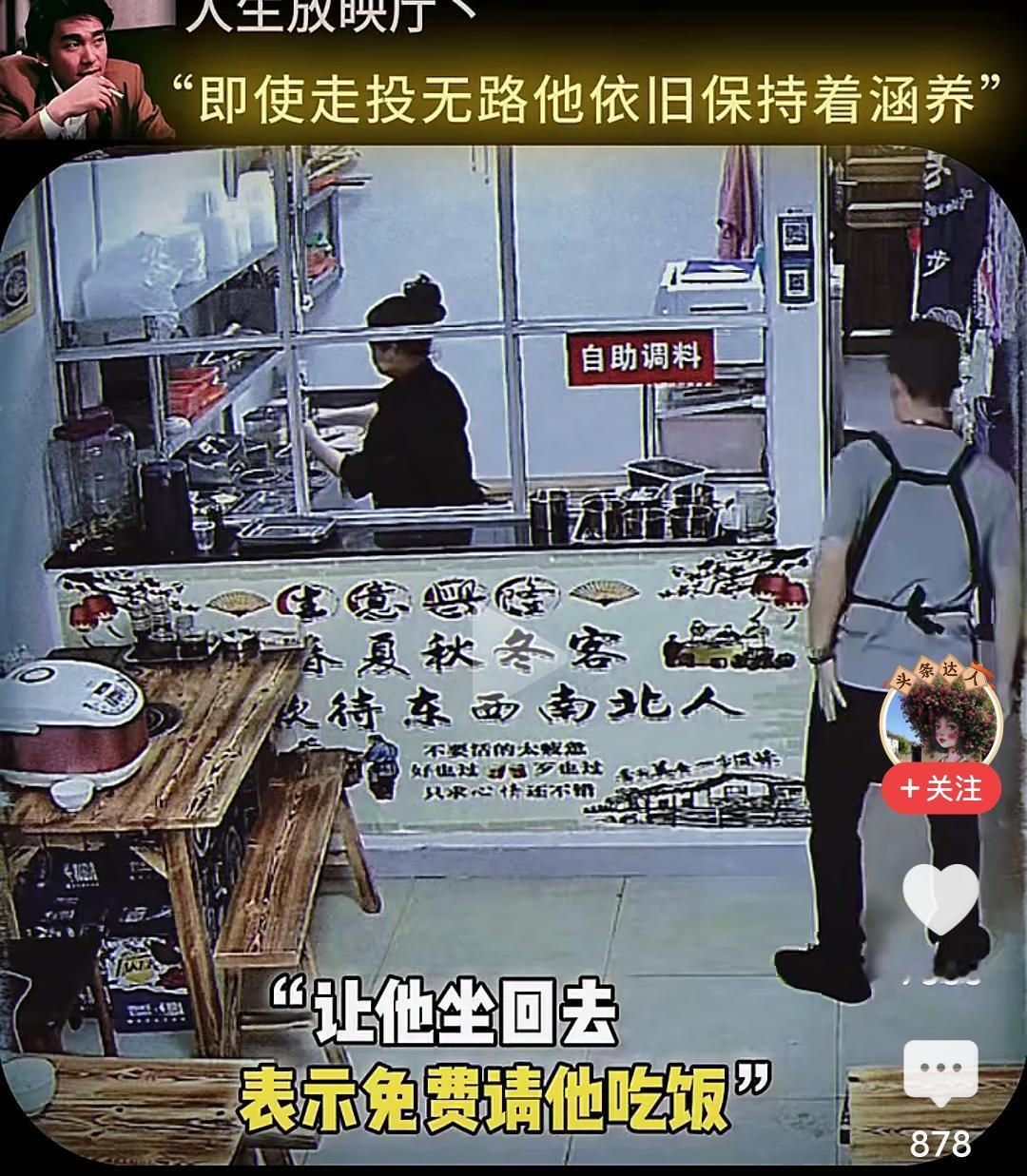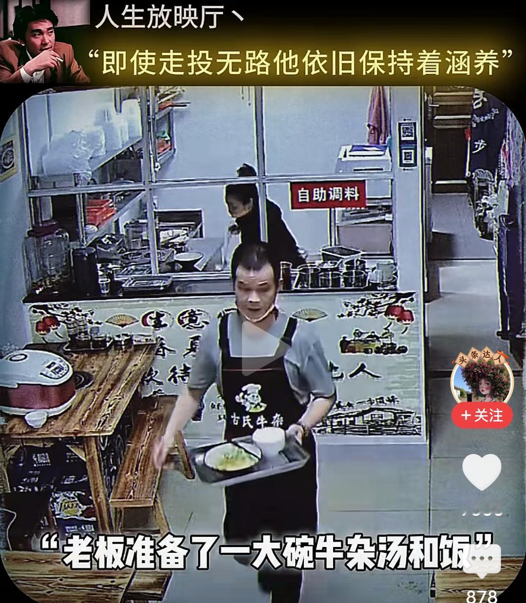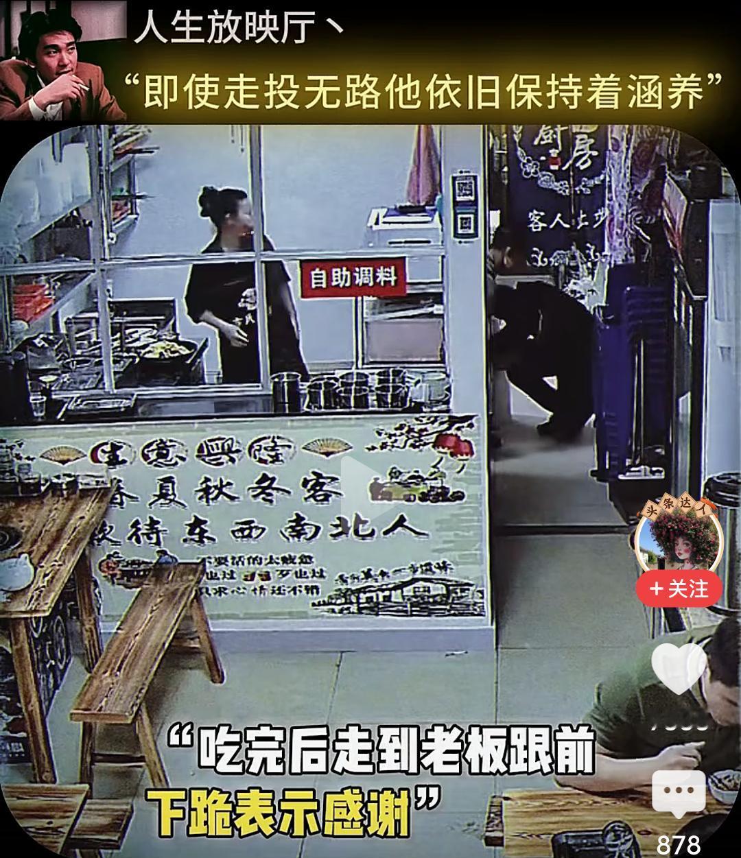 当男子跪下的那一刻,我眼泪流了出来…… 在一个小饭店,一位男子坐在角落很久也不点餐,小心翼翼的观察着对面吃饭的男人,直到对面的人结账离开,他才慢慢走上去,然后在那里摸着头纠结要不要吃这个人剩下的饭,最终还是忍不住饥饿去伸手… 而这个饭店老板早就察觉到他的异样,急忙上前拦住他,让他坐回去,表示可以让他免费吃饭,然后老板给他准备了一大份的牛杂汤和面,他边吃边擦拭着桌子,生怕弄脏了这里。 吃完饭他走到老板面前下跪表示感谢,老板扶起他后再次下跪感谢,准备离开时把地上的垃圾收拾干净,一步三回头不停的鞠躬感谢着离开…… 看的我是老泪纵横,如果不是生活太难,如果不是绝望的时候,他也不会让自己沦落至此,但即便走投无路,他依然保持着那份涵养。 他为什么会那么感激老板,因为老板拦住他不让他吃剩饭,并新做的那份面,那不仅仅是一份面,而是在落魄的时候仅剩的那一丝丝的尊严。 想一想,他也曾经被满怀期待的人十月怀胎,又视为掌中宝含辛茹苦,可到头来,很多的老实本分人终其一生,却混不到温饱,虽然,他也努力了。 一碗饭难倒一个英雄汉,如果有一天我也变成了吃饭这个男人的样子,请不要笑话我,因为我真的拿命搏过。 读了圣贤书,却管不了窗外的事,无数次想过自己开一家餐馆,有机会救助那些无家可归,无饭可吃的穷苦人,可事与愿违,自己活成了那个被救助的人。 唉,希望他能闯出来,人有品,人有格,愿他一切顺利安好!