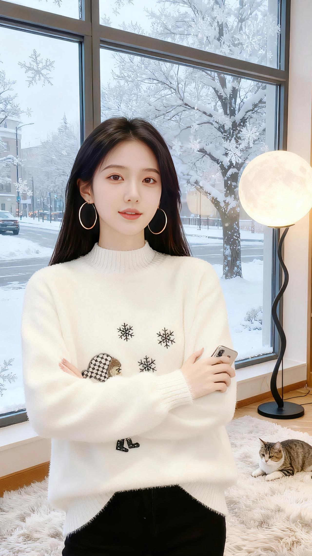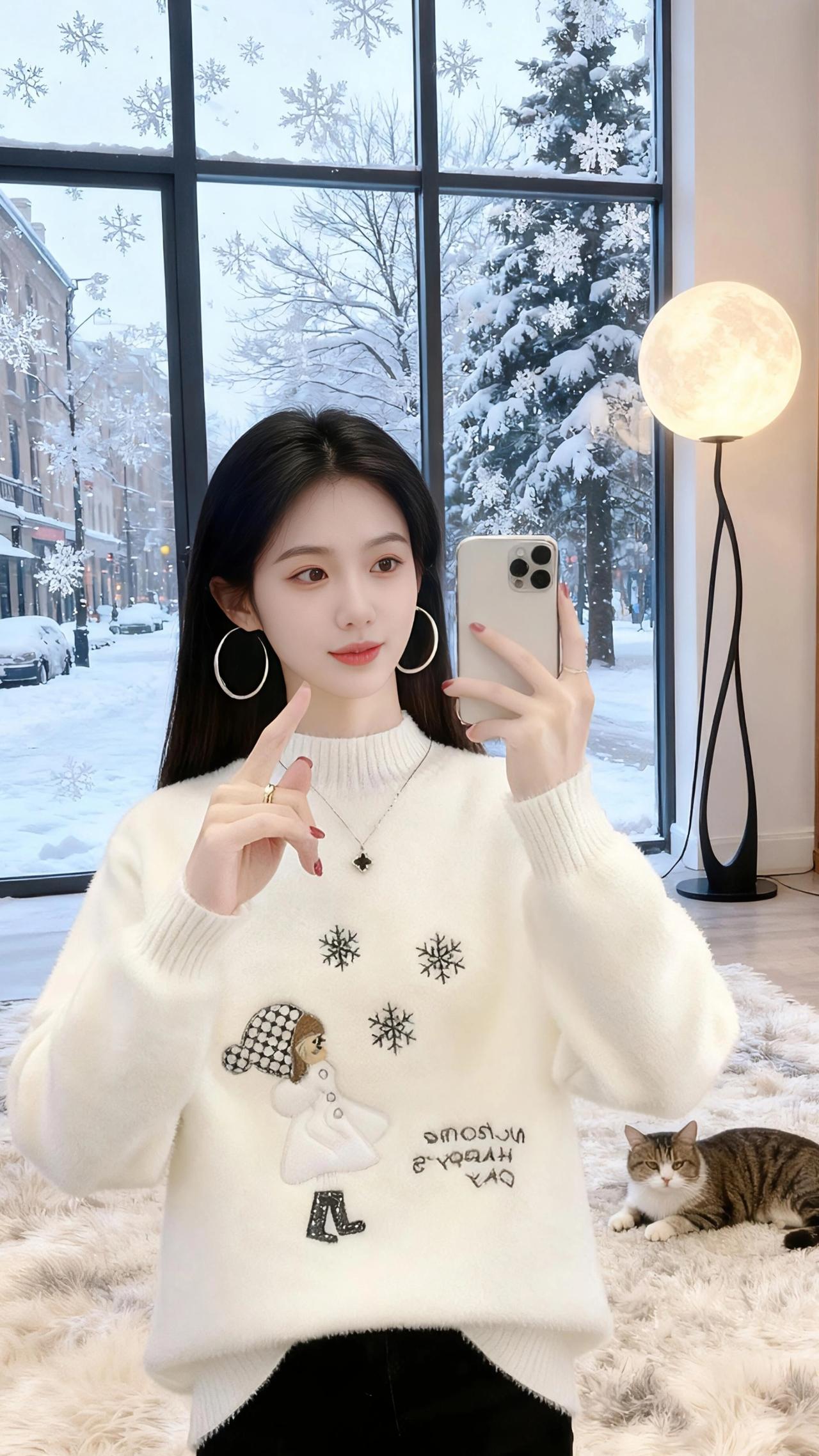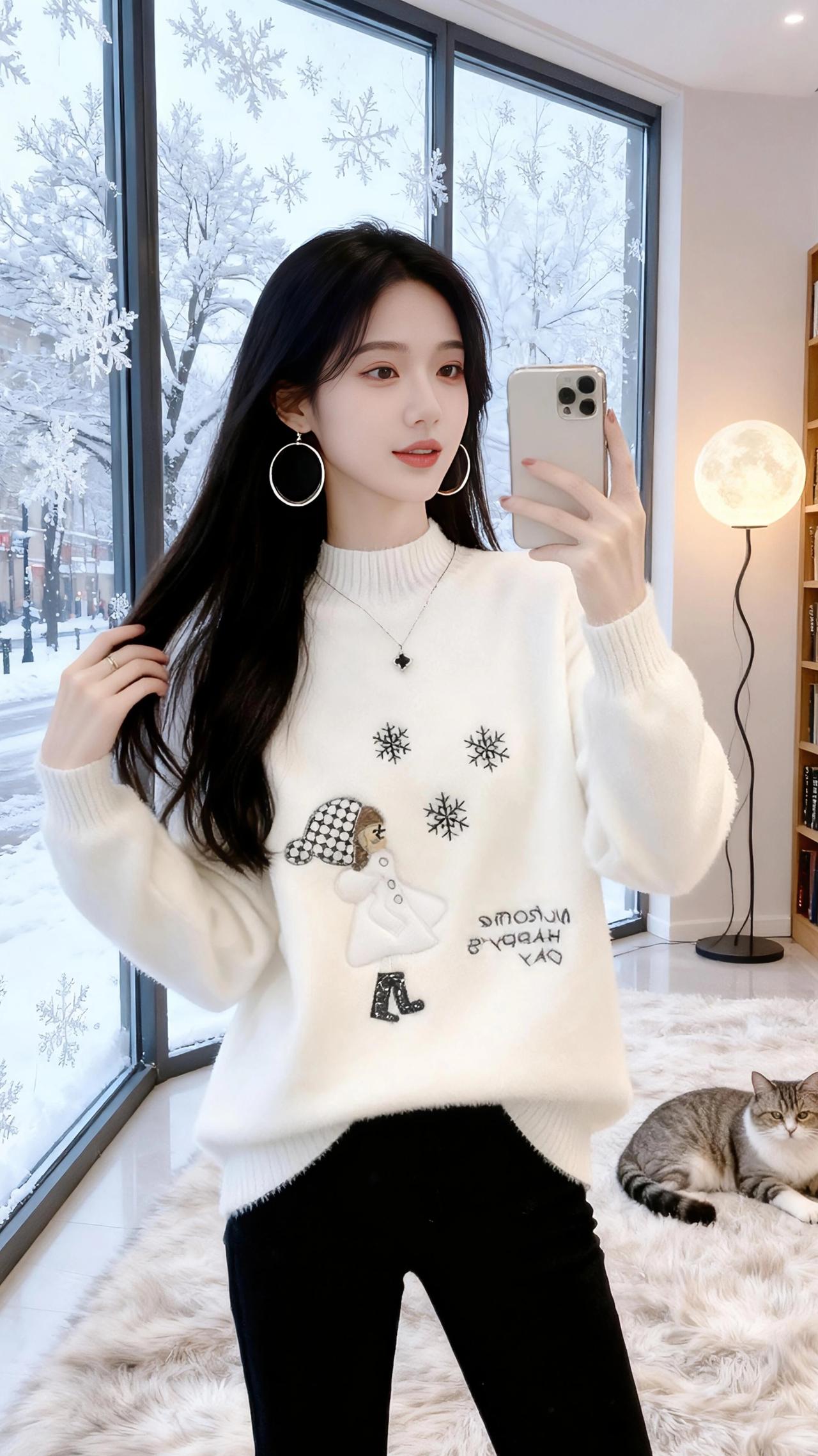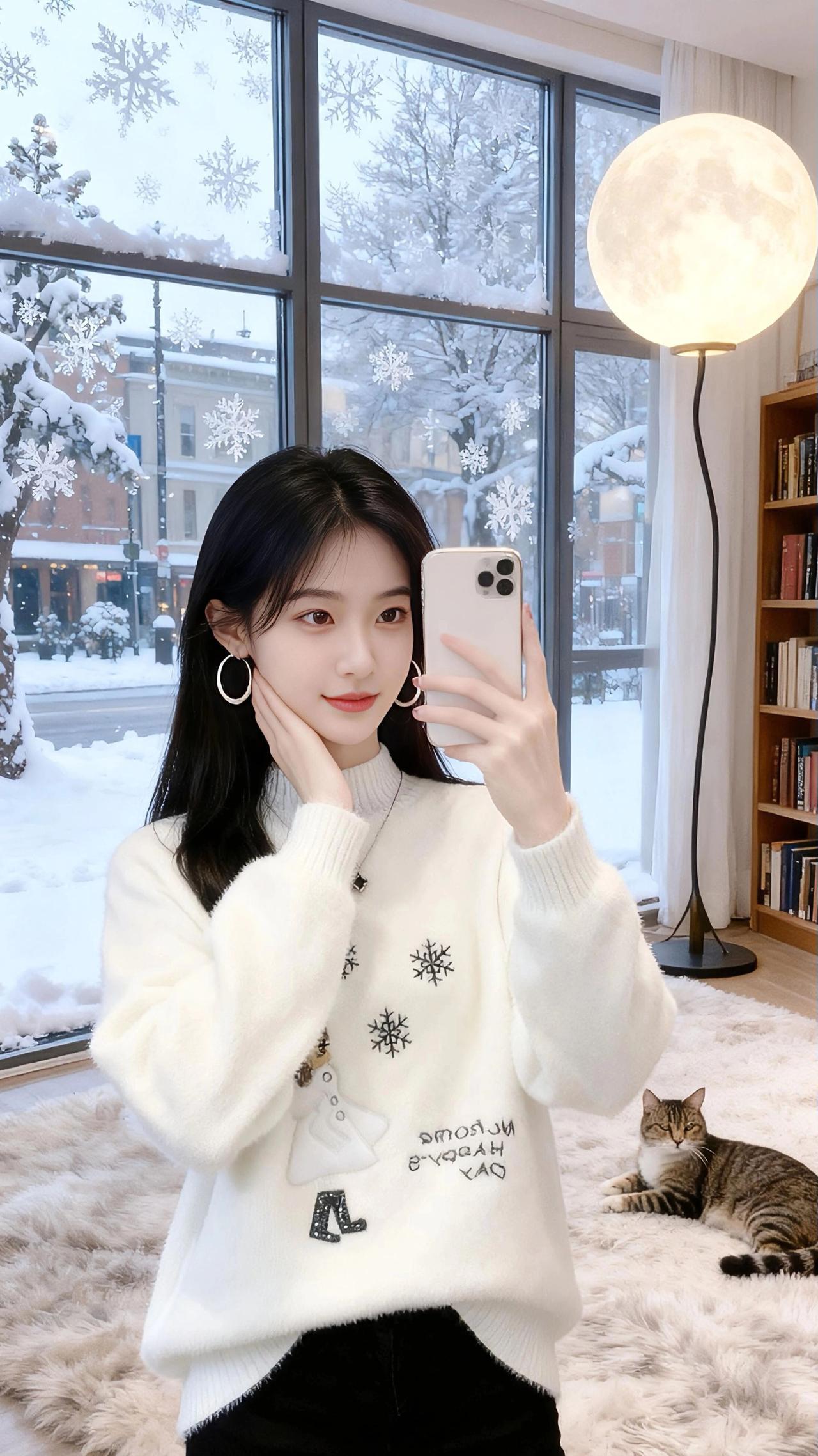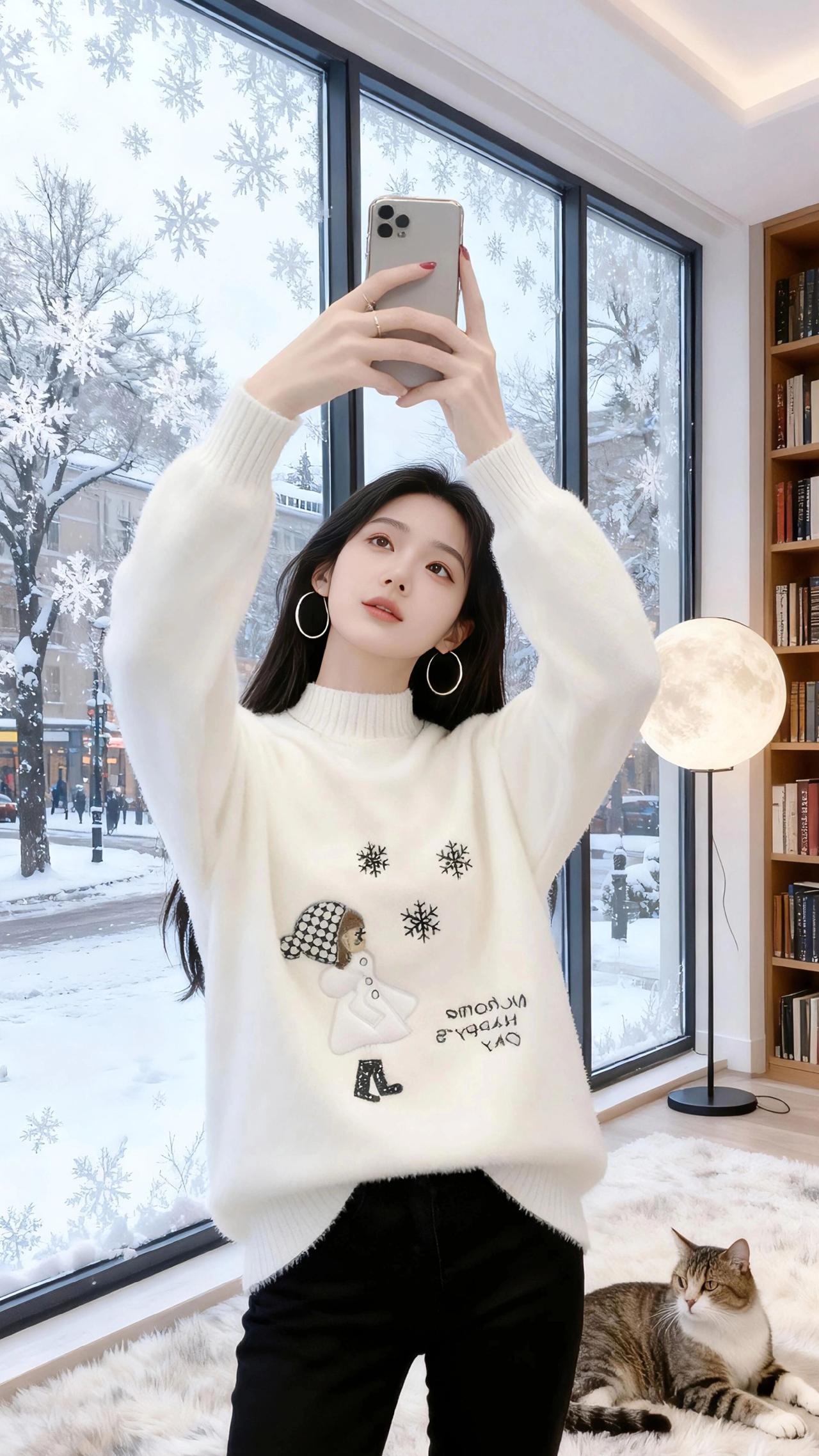 雪落的日子,她的房间是冬的温柔容器。 巨大的落地窗把窗外的银白都框成画——树裹着蓬松的雪被,街衢覆了软绒的白毯,连窗玻璃都凝着精巧的冰花,像谁偷偷描了满窗的星。室内是另一种暖:毛绒地毯陷着轻软的窝,那只猫蜷在上面,把自己团成慵懒的绒球;满月似的落地灯漫出柔光,裹着书架上半墙的书,连字页都浸了暖香。 她穿米白的毛衣,绒线软得像落雪,上面的小像和雪花,是冬偷偷绣的诗。举着手机自拍时,指尖的光、耳坠的圆,都浸在这一室的暖里——窗外是雪的清冽,窗内是生活的软,而她站在中间,是冬日最恰好的温柔小个子穿搭 秋冬穿搭 针织衫 今天穿什么 精致穿搭 。