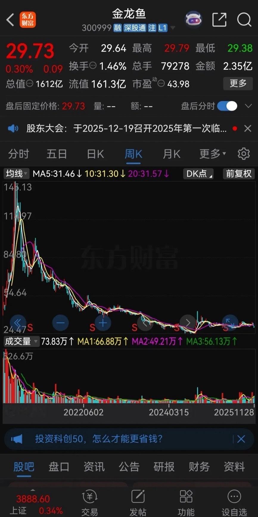 金龙鱼这是要跌成“鱼干”了吗?最近连续崩盘式下跌,10个交易日收出8根阴线,今天盘中最低跌到了29.38元,马上快到四月份关税贸易战的最低点了,这个价格已经跌到了3200点下方了,至少落后大盘800点,较去年十月份高点下跌了24%,今年进场的股民基本都被套牢了。2020年金龙鱼刚上市的时候被称为“油茅”,股价最高涨到了145元,连股神林园都非常看好,许多股民都做起了价值投资,准备长期持有。谁能想到四年时间股价腰斩了两三次,现在跌得一地鸡毛,长期持股的股民亏得鼻青脸肿,高位套牢的股民恐怕这辈子都很难解套了!