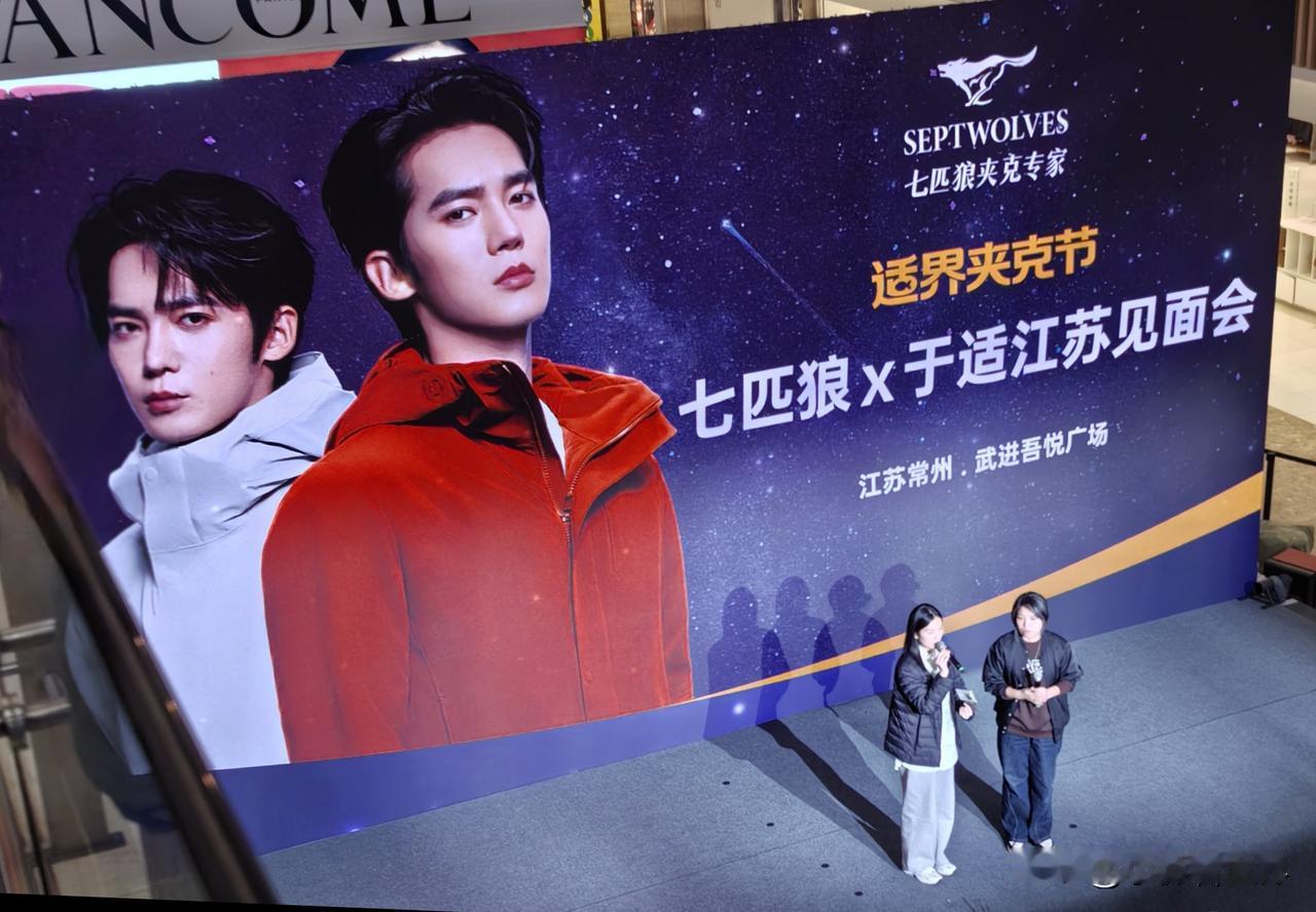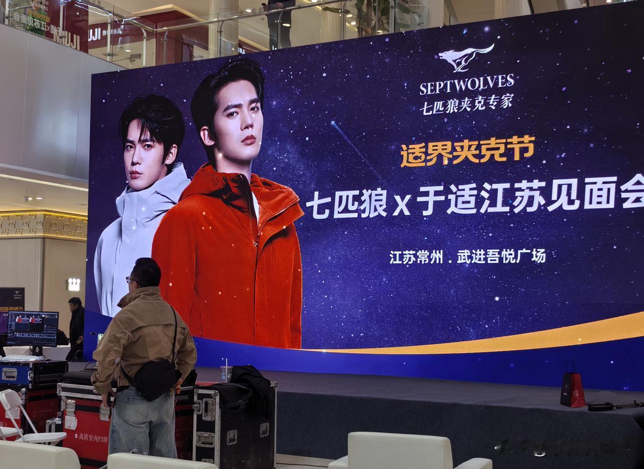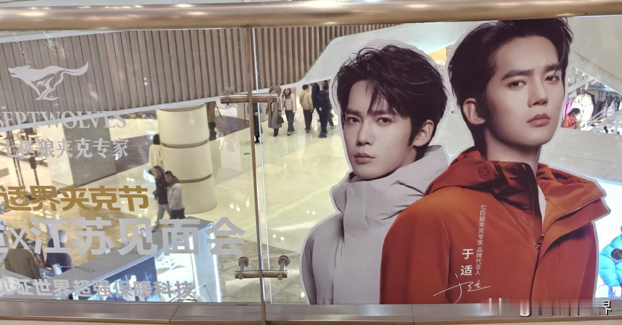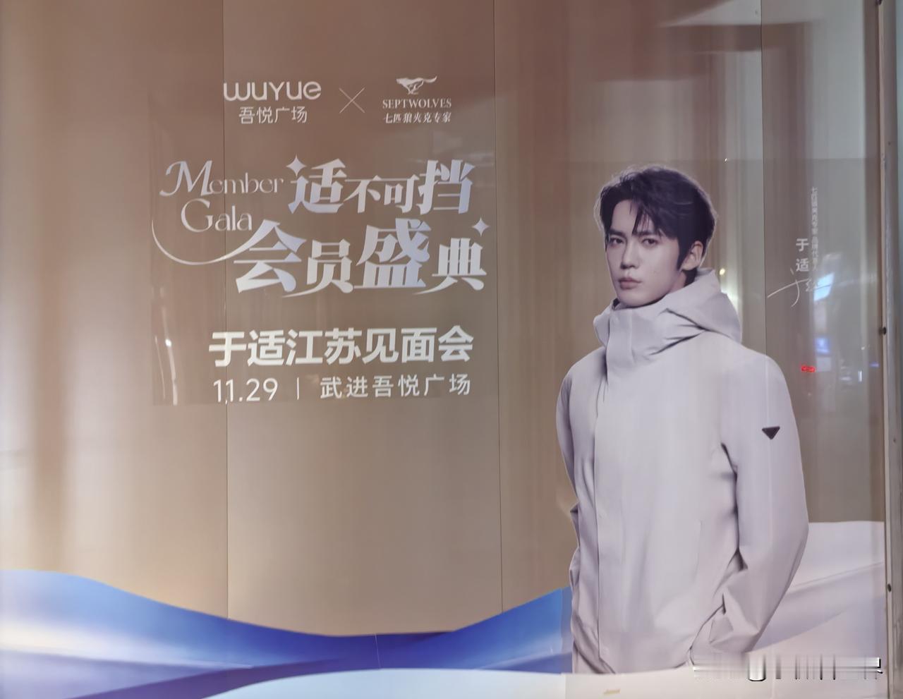 咦!怎么这里这么多于适的宣传海报? 走进吾悦广场,才知道29号就是今天有七匹狼于适见面会,“商旅新适力,于你同行,适在必赢”,主持人正在为适应场地做准备呢。 然后一路过去,看到不少于适的活动宣传照片。看来是万事俱备只欠东风啦! 甚至商场外面的宣传版前,还有美女正在和照片上的于适合影呢! 于适是凭电影《封神第一部:朝歌风云》里饰的姬发而一炮走红的,最记得他从城楼下纵身一跃而下飞身上马的镜头,真是太勇敢太帅了。 后来又因为电视剧《我的阿勒泰》里巴太一角而为人们熟知,于适将观众心中鲜衣怒马,英姿飒爽的少年形象,演得真实又具象,将男人该有的雄浑洒脱、阳光野性,完美展现。 所以如今作为七匹狼最新代言人,对于品牌年轻化和服装销售来说,是一个比较积极的信号。 今天,喜欢于适的人有福气了,可以去吾悦广场一睹他的风采哟。