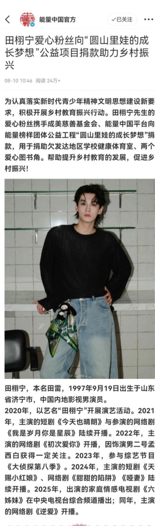 田栩宁捐赠30万田栩宁本人以及杂志方品牌方粉丝携手累计170万,众人拾柴火焰高,偶像的真正价值!之前柠檬水跟着田栩宁默默做公益还被官方表扬,这才是一个艺人应该起到的表率作用啊,一个很好的人,带动了一群很好的人,传递更多的美好。