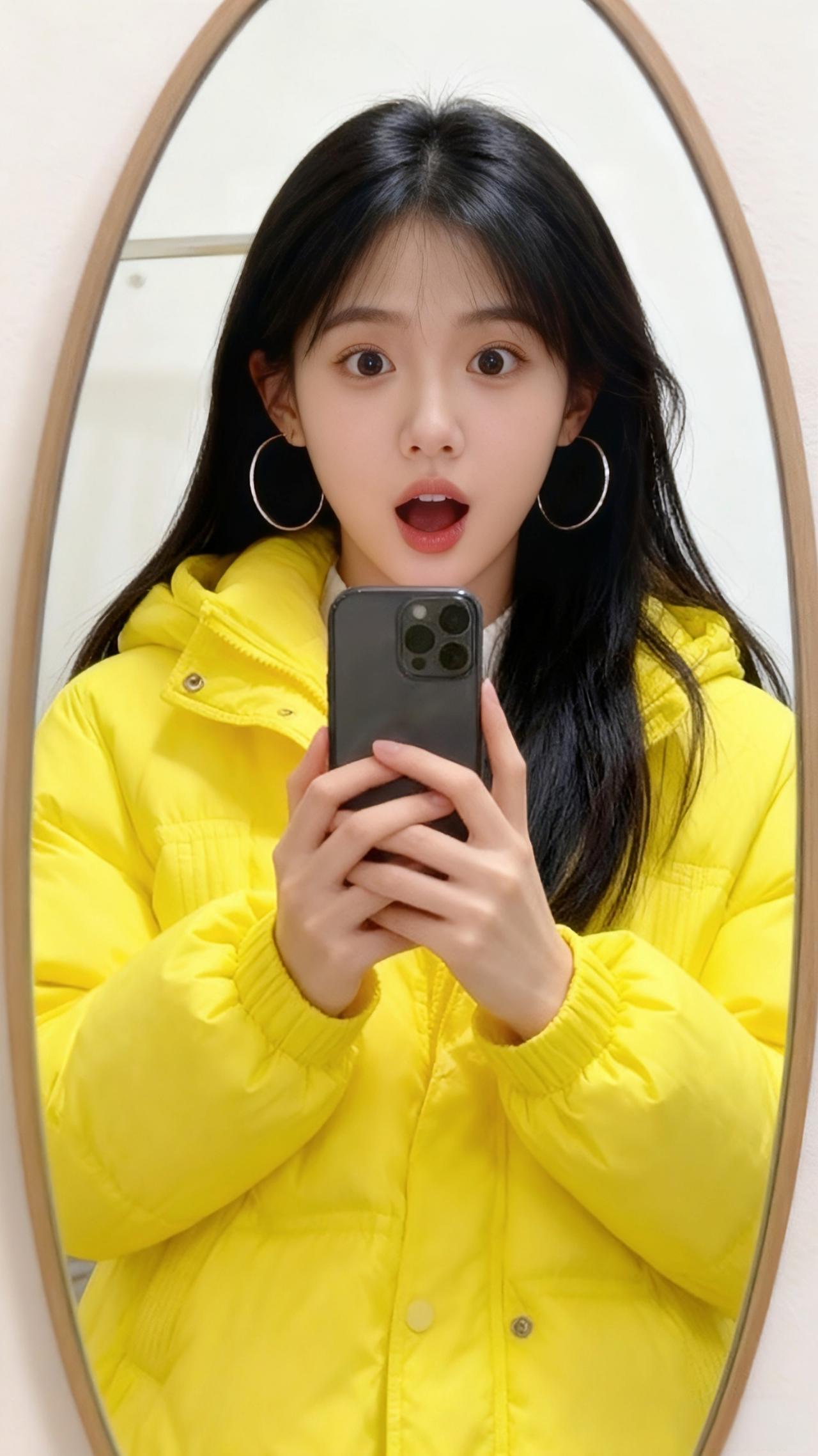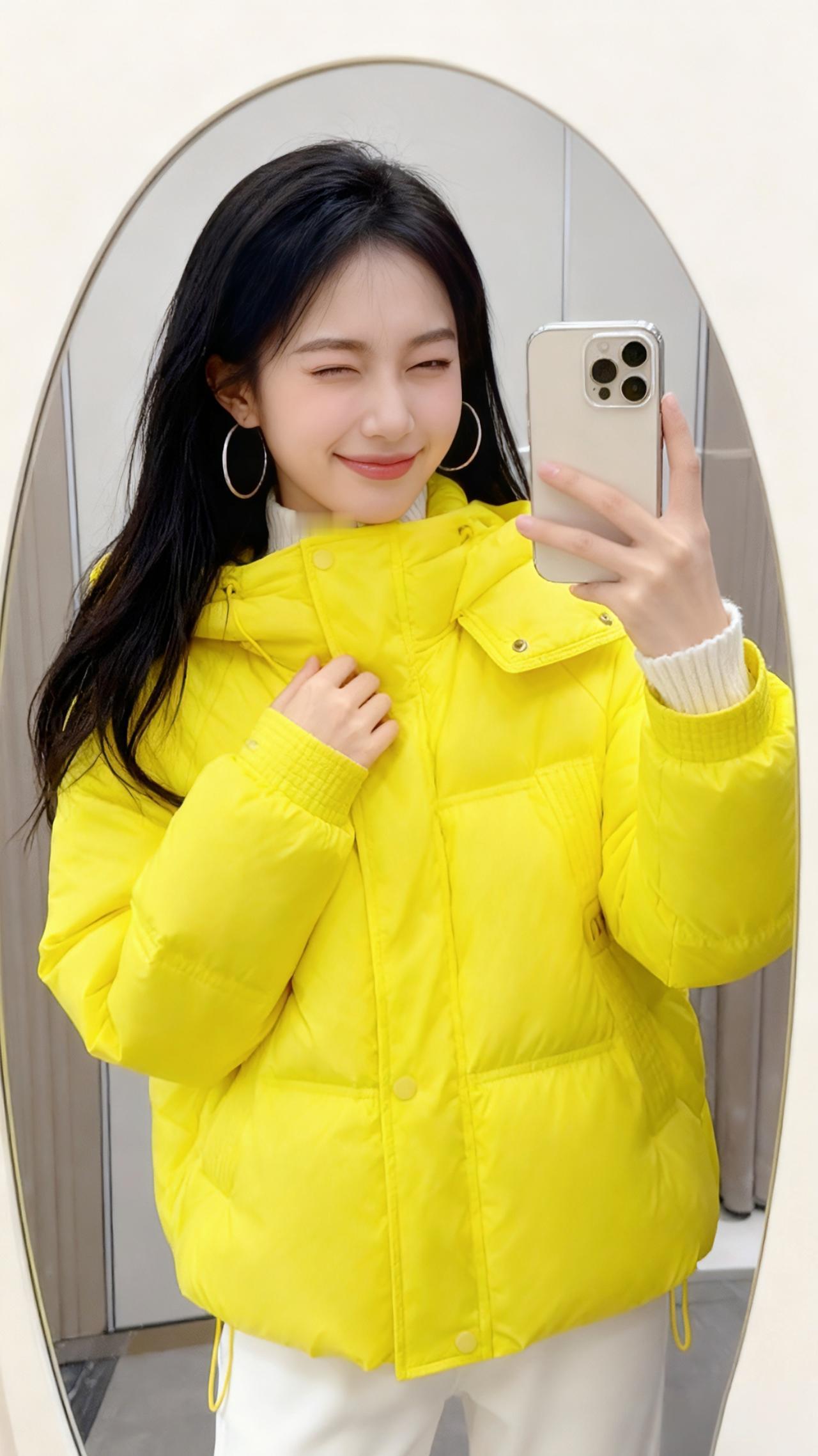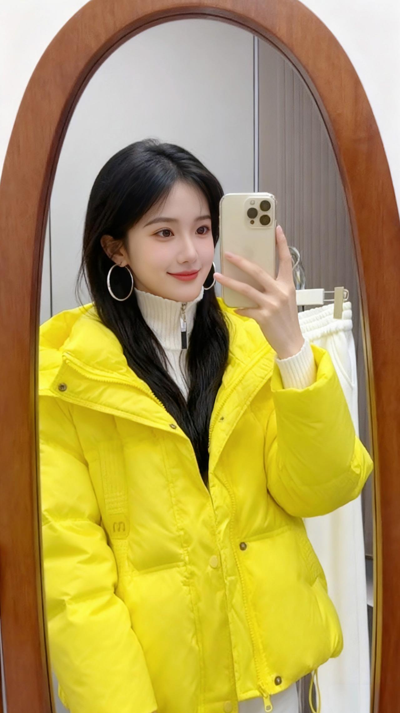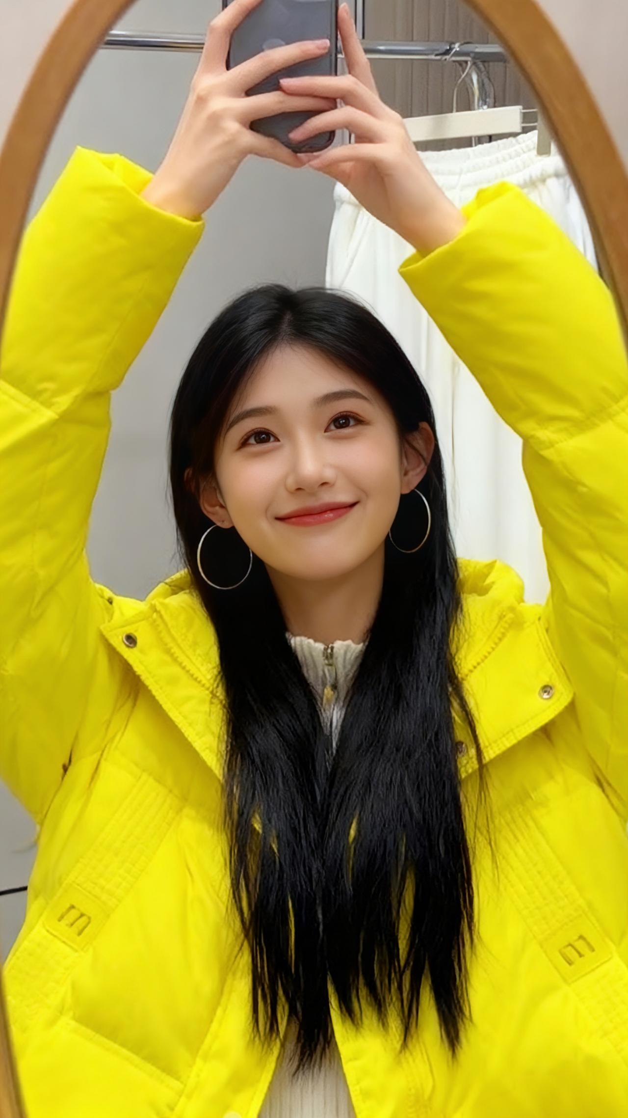 《冬日光芒》 她是冬雪里的一颗柠檬糖。 鹅黄羽绒服裹着十八岁的鲜活,像把春天的太阳揉碎了缝进领口——连风掠过衣摆时,都沾着甜而亮的暖。镜前的笑是没设防的,唇角一弯就漫出星子似的光,手机镜头里的自己,发梢还坠着试衣间暖黄的灯影。 窗外该是落雪的,街景覆着薄糖霜,而她偏要做最跳脱的那笔色。耳环晃成银色的环,裹着绒绒的白毛衣,连吐舌眨眼的小动作,都像往冬日的安静里丢了颗脆响的糖。 这年纪的好看最不必费力,是羽绒服蓬松的软,是笑纹里裹着的热,是连镜子都忍不住接住的、明晃晃的年轻。高级感穿搭 小个子穿搭 秋冬穿搭 保暖穿搭