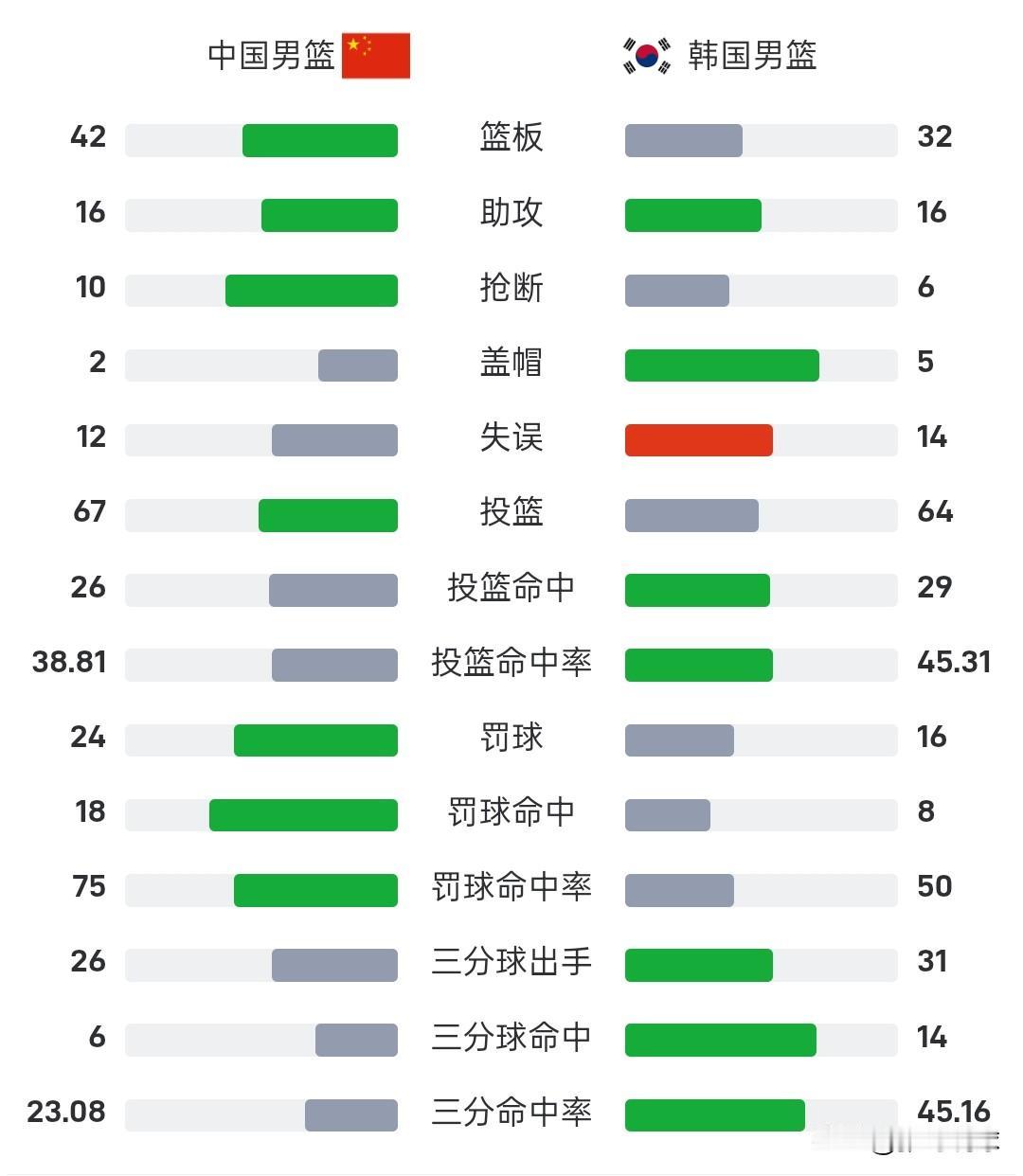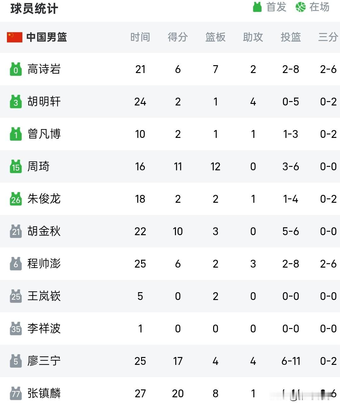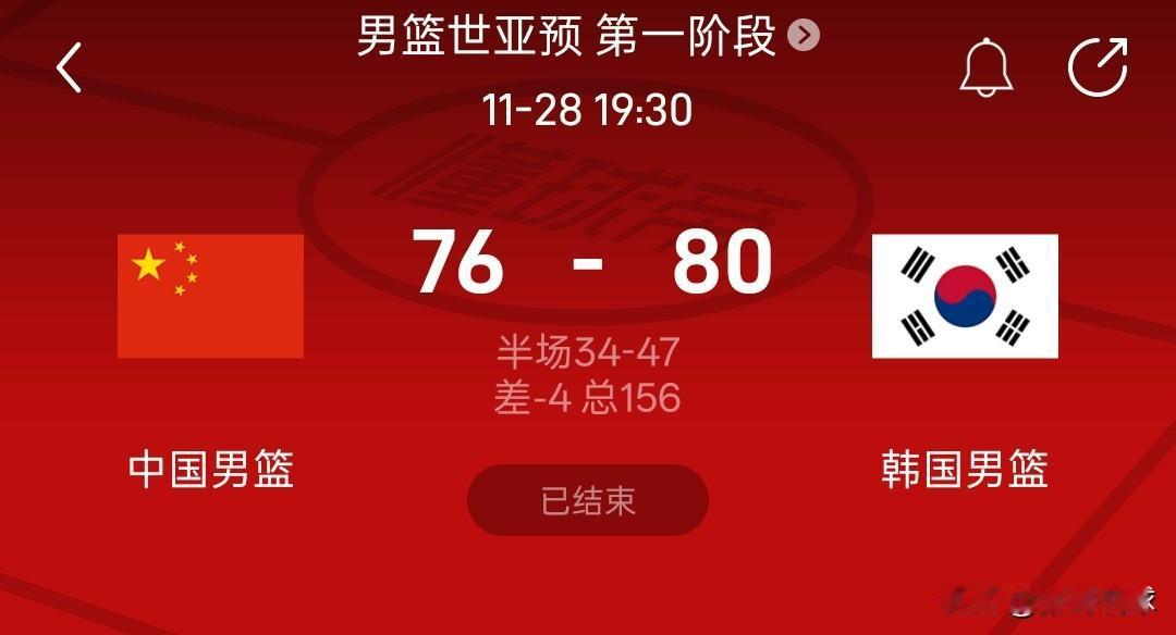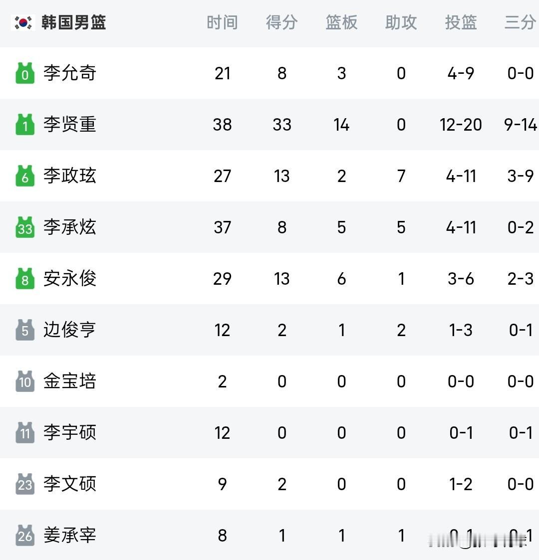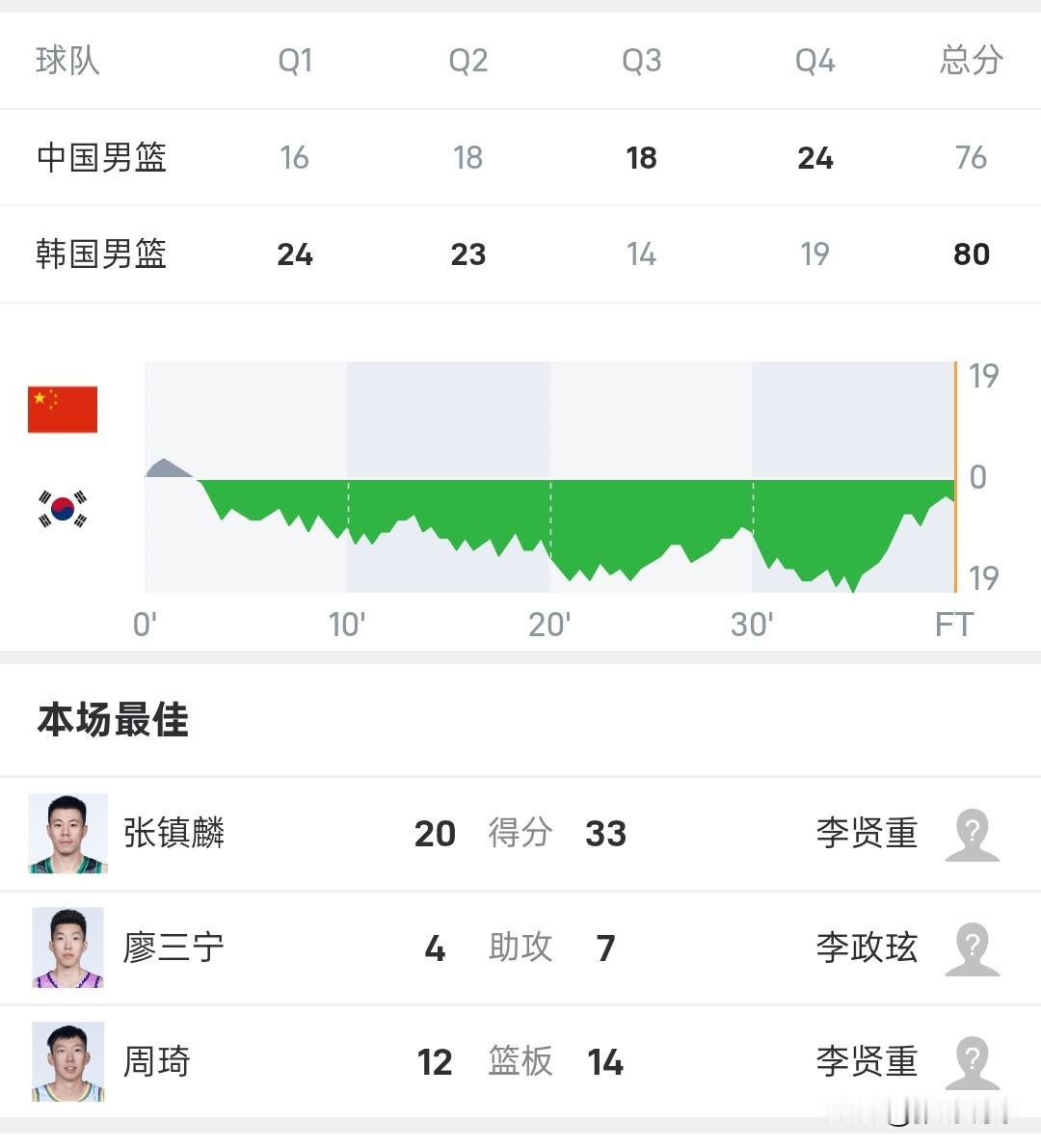 中国男篮76-80输给韩国队,中国队在主场五棵松体育场输给老对手韩国队,中国队全场比赛都在落后,张镇麟最后时刻连续错失绝平的机会。 中国队三分球投出23%的命中率,三分球26投6中,自家的篮筐怎么能投出这样的命中率呢,首发出场的胡明轩,曾凡博、朱俊龙都是只拿到两分。 镇麟20分8板,周琦11分12板,廖三宁17分5板6助,胡金秋10分;韩国男篮李贤重33分14板其中三分14中9,李政炫13分7助,安永俊13分7板。