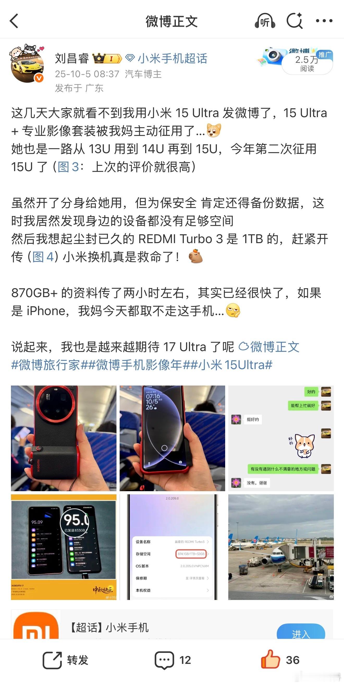 今早我妈出发短途旅行,征用了我的 + 专业摄影套装,我换回 用一天小米和 iPhone 互联支持双向通知同步(图1)她一大早就出门了,但我 iPhone 刚刚收到了 15 Ultra 的通知(图2)所以挺神奇的,好奇背后的机制…我妈今年第三次征用 15U,对它的影像和续航赞不绝口,越来越期待 了!
