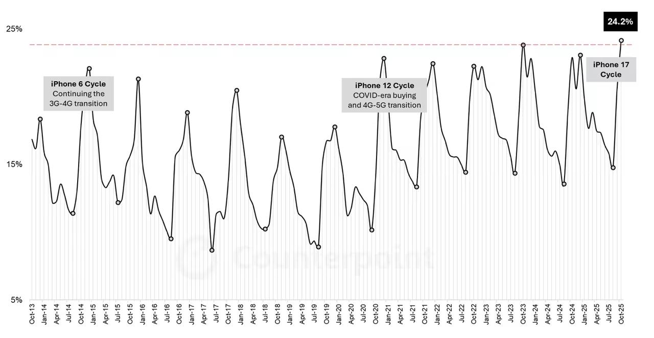 苹果 2025 年 10 月 iPhone 销量同比增长 12%,终端销量份额飙升至 24.2%,创下历史新纪录。 上市后六周表现上,iPhone 17 系列全面超越了去年的 iPhone 16 系列。