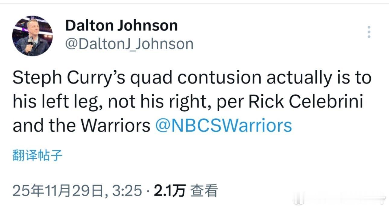 勇士医疗主管Rick Celebrini称,库里的股四头肌挫伤实际发生在左腿,并不是右腿。