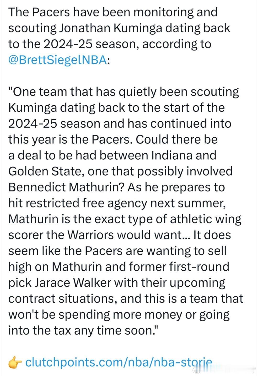 Brett Siegel:步行者一直低调关注和考察库明加,鹈鹕也是潜在交易对象,墨菲和琼斯为心仪对象。该记者报道,勇士队持续向外界释放讯号:他们不会为了交易而交易库明加。球队会评估所有提升内线深度和侧翼运动能力的交易。勇士会希望得到能够提供尺寸、并扮演威金斯当年角色的侧翼球员。步行者从2024-25赛季开始就一直低调考察库明加,马瑟林将在明夏成为受限自由球员,他正是勇士希望放在斯蒂芬·库里、巴特勒和格林身边的那类具运动能力的侧翼得分手。步行者似乎愿意在球员价值处于高点时出售马瑟林和首轮秀贾勒斯·沃克,考虑到他们接下来的续约状况;此外,这支球队并不打算继续增加薪资或缴纳奢侈税。因此外界预期他们会在截止日前送走像马瑟林这样的合同,尤其考虑到他们明年大概率会拿到前五顺位的选秀权。除了步行者,另一支勇士可能会与之探讨库明加交易的球队是鹈鹕。赫伯特·琼斯和特雷·墨菲都是勇士非常心仪的类型,他们是勇士希望在涉及库明加的交易中得到的那类多功能侧翼。 库明加的潜在追求者,老面孔仍然活跃。太阳队和国王队依然对库明加保持兴趣。目前尚不清楚之前曾考虑追求库明加的公牛,此次是否仍有意愿参与。