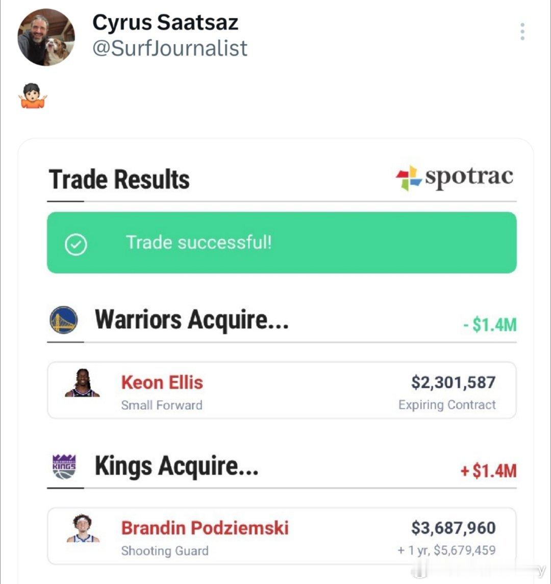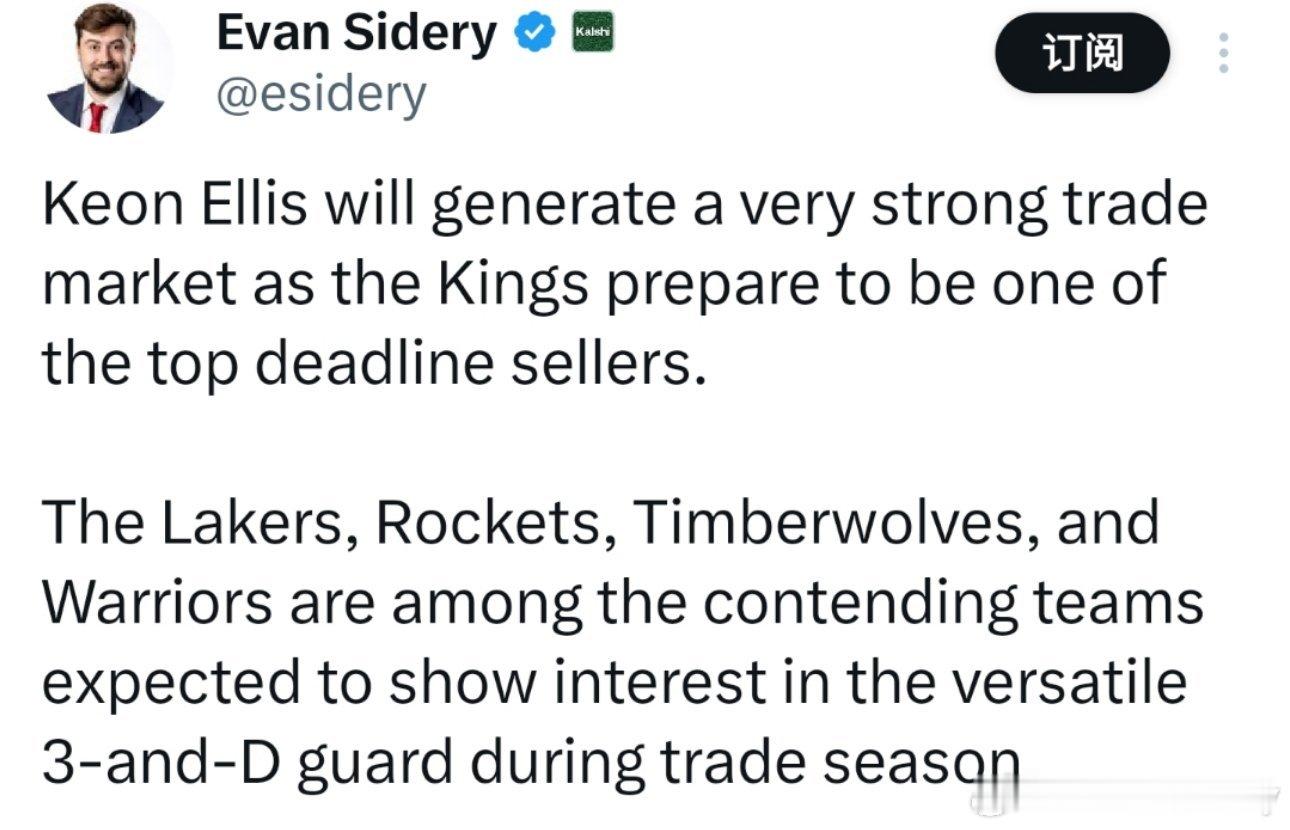Evan Sidery:基恩·埃利斯将会在交易市场掀起热潮。国王准备成为交易截止日前的顶级卖家。勇士,湖人,热火和森林狼等争冠球队预计会对这位多才多艺的3D后卫表现出兴趣。 另一名记者Cyrus Saatsaz晒出模拟交易:波姐换埃利斯🤷🏻♂️