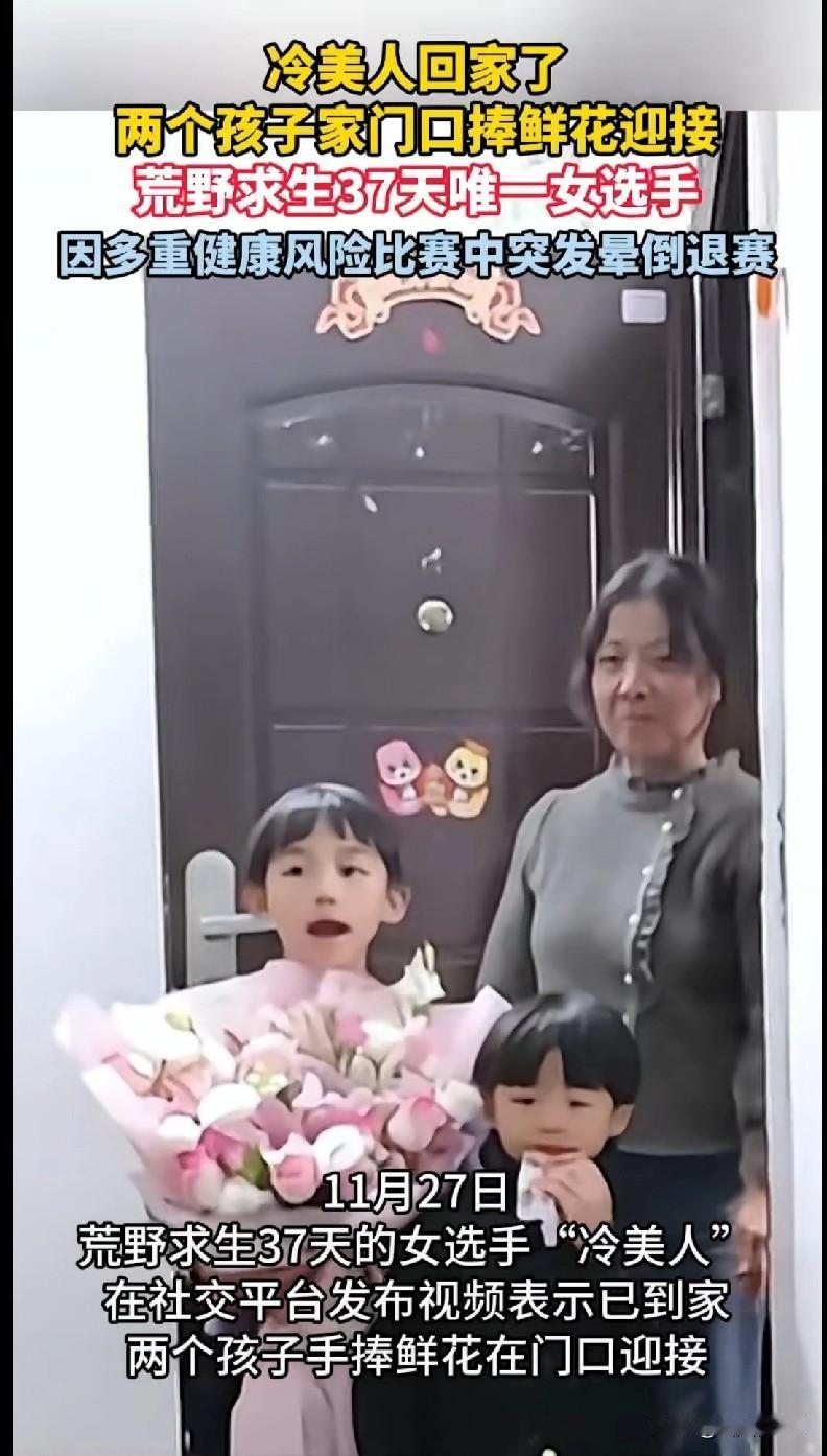 谁看了不心疼!荒野求生37天的“冷美人”回家,俩娃抱花等在门口 谁懂啊!那个在荒野求生里撑了37天的唯一女选手“冷美人”,今天终于回家啦! 11月27日她发视频,一开门俩娃举着大束粉花扑过来,那小眼神又盼又软,看得人鼻子一酸。 这姐们儿也是真刚——在野外扛了快一个月,最后因为身体扛不住突然晕倒才退赛,想想又拼又让人心疼。 评论区全在刷“姐姐好好休息”“娃也太会疼人了”,果然再厉害的女战士,回家也能当被宠的人~ 咱就是说,这种又飒又暖的场面,真的看多少遍都觉得治愈!