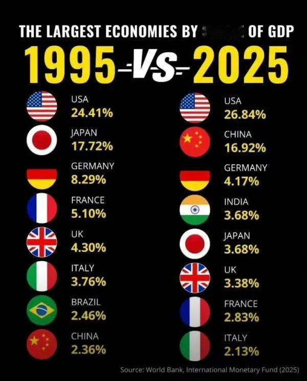 当经济份额被侵蚀的时候,战争的赌徒心理就会死灰复燃。 日本三十年间,GDP世界份额被中国挤压并几乎替换了,所以日本民粹上位,高市早苗企图引入战火的政治悲剧就滋生了。 1995年俄罗斯GDP全球占比约为1.0%-1.2%。 2025年俄罗斯GDP全球占比约为3.48%。 “越战越有钱”的普京理论是否也成为高市早苗慕战的注脚?