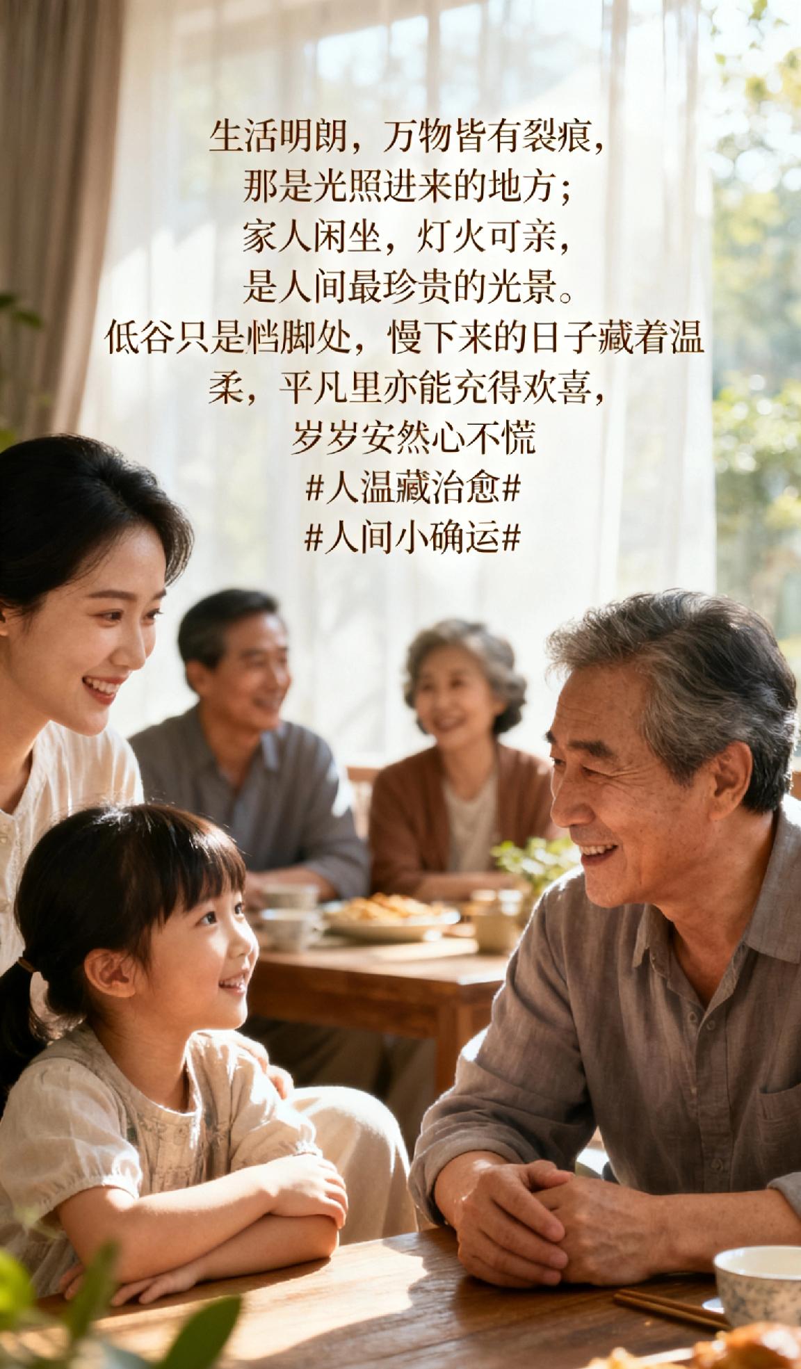 生活明朗,万物皆有裂痕,那是光照进来的地方;家人闲坐,灯火可亲,是人间最珍贵的光景。低谷只是歇脚处,慢下来的日子藏着温柔,平凡里亦能拾得欢喜,岁岁安然心不慌 珍藏短句 温柔治愈 人间小确幸