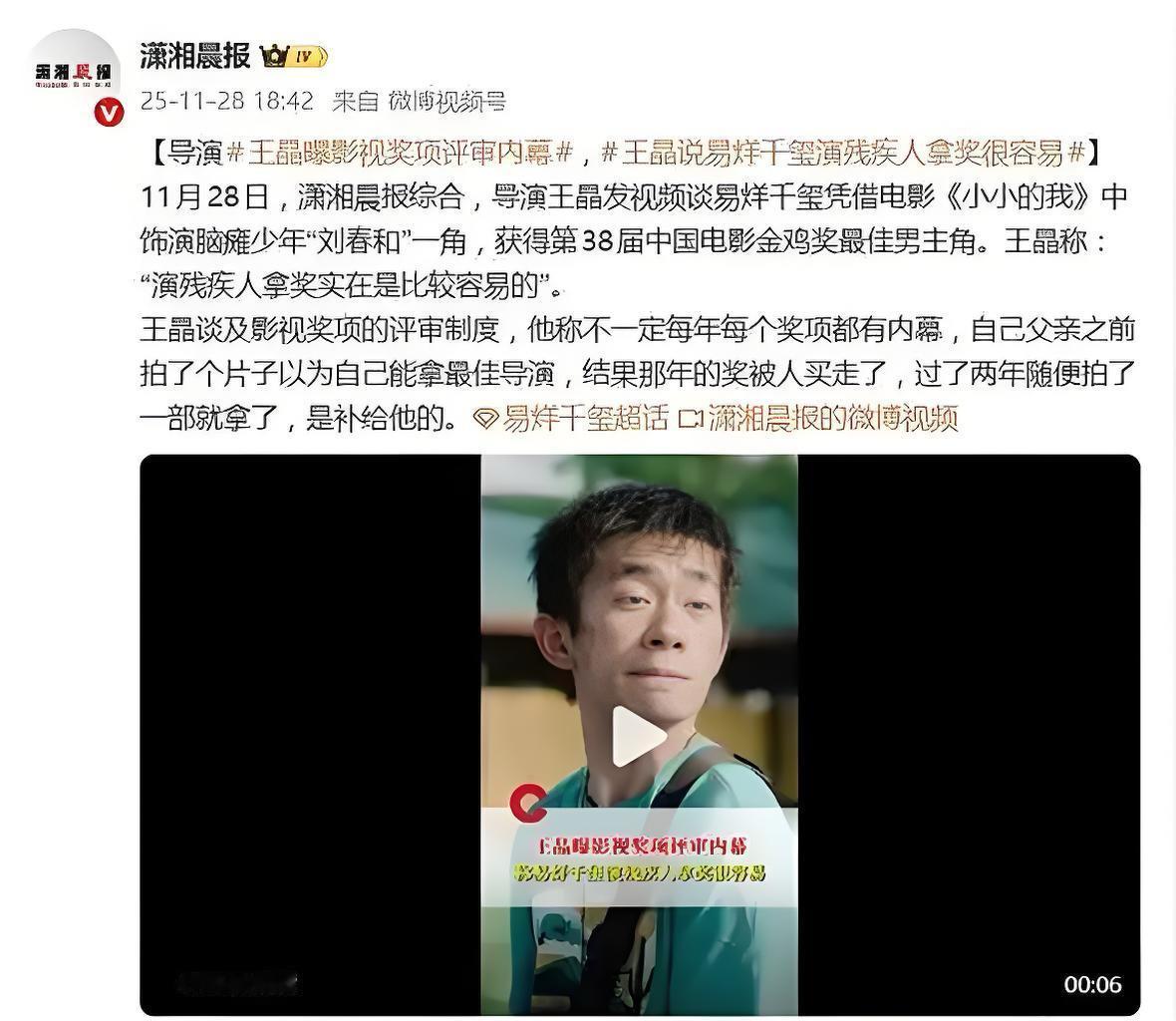 导演王晶称易烊千玺演残疾人拿奖很容易? 没人能凭“题材讨巧”拿下四次金鸡提名。易烊千玺从北到刘春和,每一步都在打破流量偏见。为贴近脑瘫患者,他扭曲体态拍戏、杀青后需复健,这份敬业不该被“拿奖容易”轻飘飘否定。奖项是对角色塑造的认可,更是对演员沉心打磨的回馈。